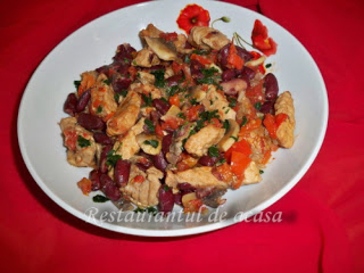 Ghiveci de legume si carne PrecedentulUrmătorul Felul principalFoarte ușor45 min Trimite unui prieten Printează pagina Adresează o întrebare autorului Postează o poză cu rețeta gătită de tine Ingrediente 6 500 g carne de porc sau vita , 1 conserva fasole rosie , 2-3 rosii sau o conserva rosii , 4-5 ciuperci , 1 ceapa , 1 ardei gras , sare , piper , ulei, patrunjel verde