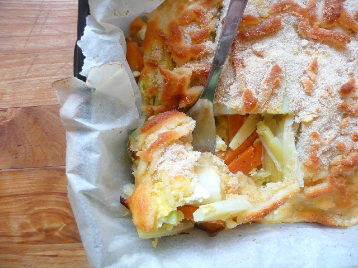 Gratin de legume cu branza de capra PrecedentulUrmătorul Felul principalFoarte ușor40 min Trimite unui prieten Printează pagina Adresează o întrebare autorului Postează o poză cu rețeta gătită de tine Ingrediente 4 2 linguri de unt 8 fire de praz tanar 3-4 morcovi 2 buc. pastarnac 2 oua 200 g branza de capra rasa jumatate cana de lapte batut sau iaurt o jumatate cana de pesmet jumatate cana de cascaval ras sau parmezan sare, piper