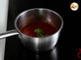 Se adaugă sosul de roșii, câteva frunze de busuioc, se condimentează cu sare si se fierbe la foc mic timp de 30 de minute.