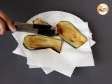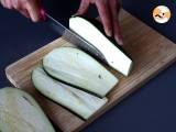 Între timp, spălați vinetele și tăiați capetele. Tăiați-le pe lungime la o grosime de aproximativ 5 mm (puteți folosi și o mandolină reglabilă).