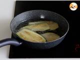 Într-o tigaie cu margini înalte, încălziți uleiul și prăjiți feliile de vinete, două câte două (sau mai multe dacă tigaia este mai mare).
