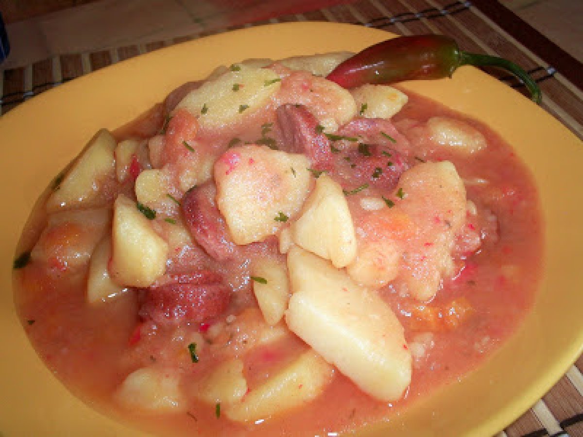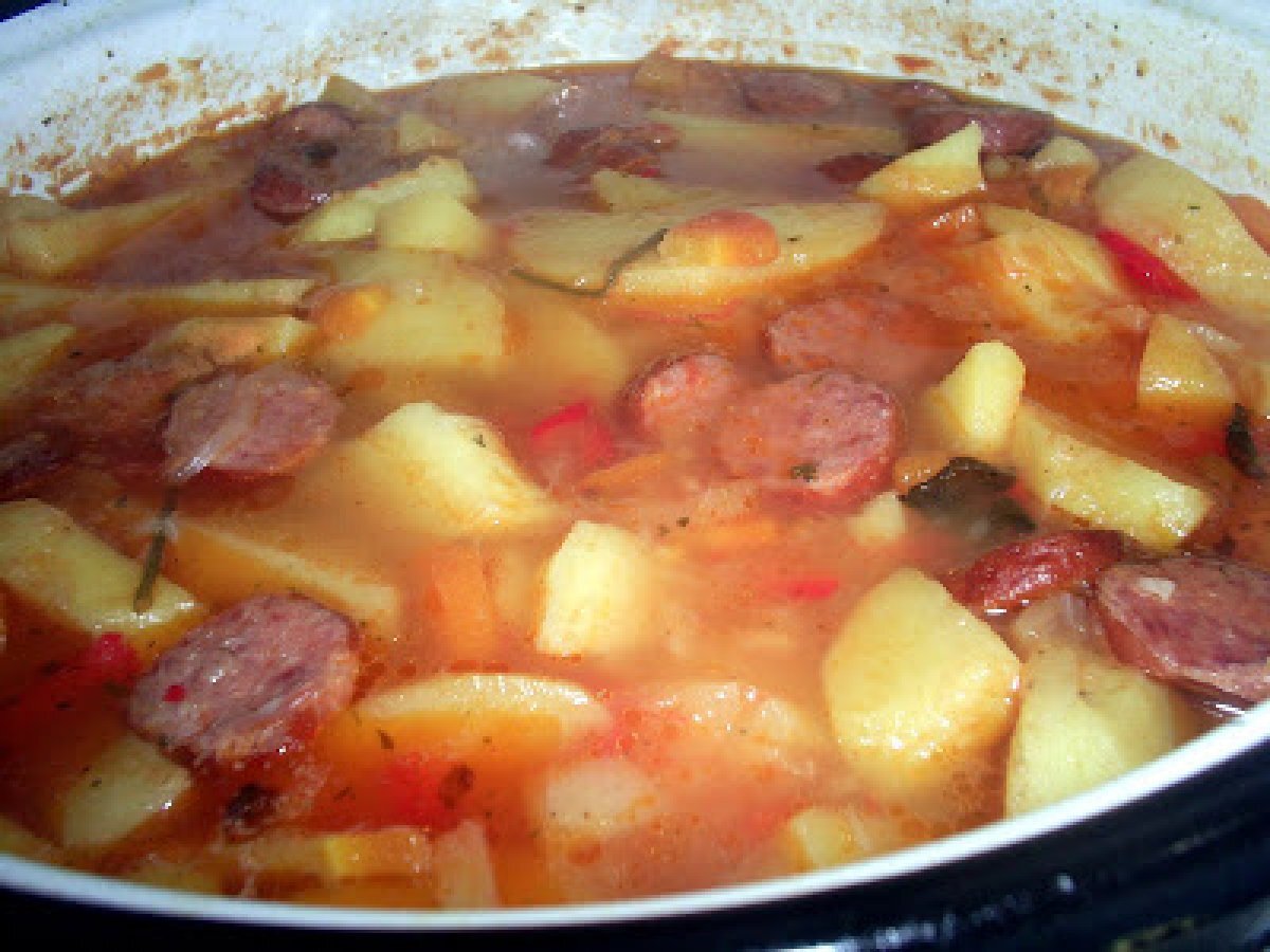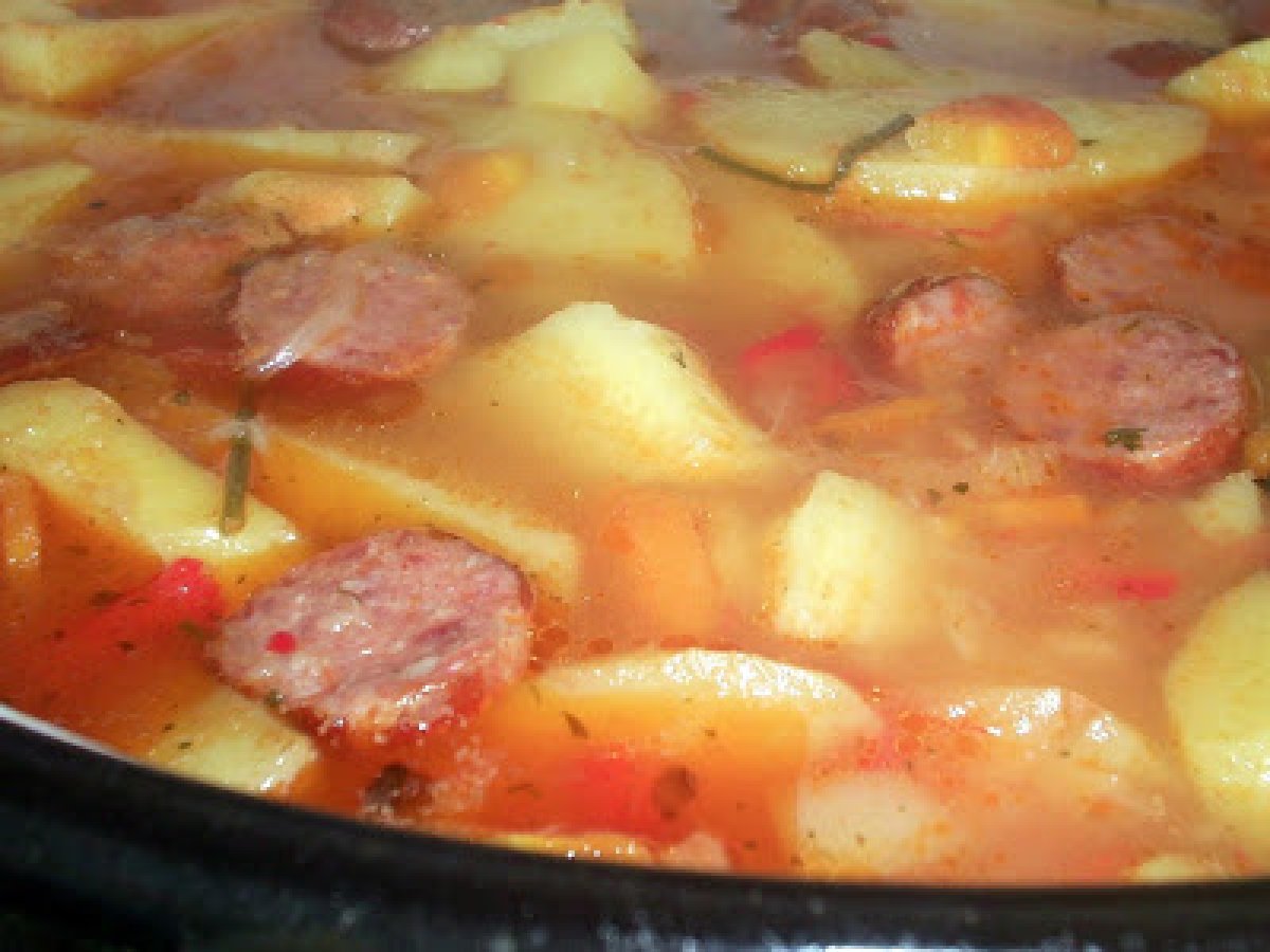 Gulas de cartofi cu carnati PrecedentulUrmătorul Felul principalFoarte ușor45 min Trimite unui prieten Printează pagina Adresează o întrebare autorului Postează o poză cu rețeta gătită de tine Ingrediente 4 1 kg cartofi 3 cepe 1 ardei si 1 gogosar rosu 1 morcov 2 rosii decojite 2 buc. usturoi 4 carnati usor afumati bulion sare, piper verdeata