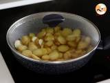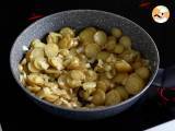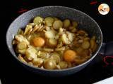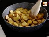 Spălați și tăiați cartofii în felii. Se toarnă într-o tigaie încinsă: apa, uleiul de măsline, sarea, piperul, boiaua și se adaugă cartofii. Se amestecă împreună.