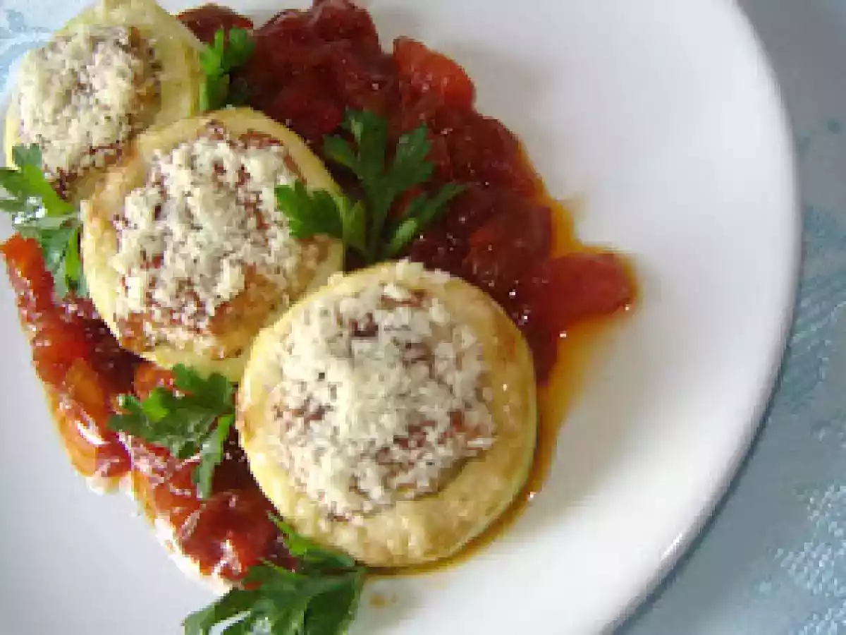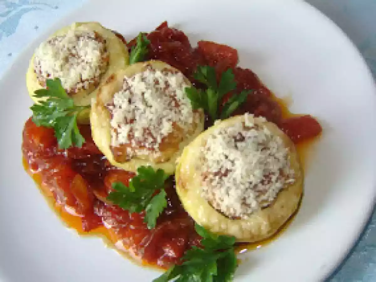 Inele de dovlecei cu piept de pui si rosii PrecedentulUrmătorul Felul principalFoarte ușor45 min Trimite unui prieten Printează pagina Adresează o întrebare autorului Postează o poză cu rețeta gătită de tine Ingrediente 2 un dovlecel o jumatate de piept de pui 2 linguri de smantana 2 linguri cascaval ras 1 lingura de pesmet sare si piper cimbru o ceapa mijlocie 2 rosii 2 linguri pasta de tomate