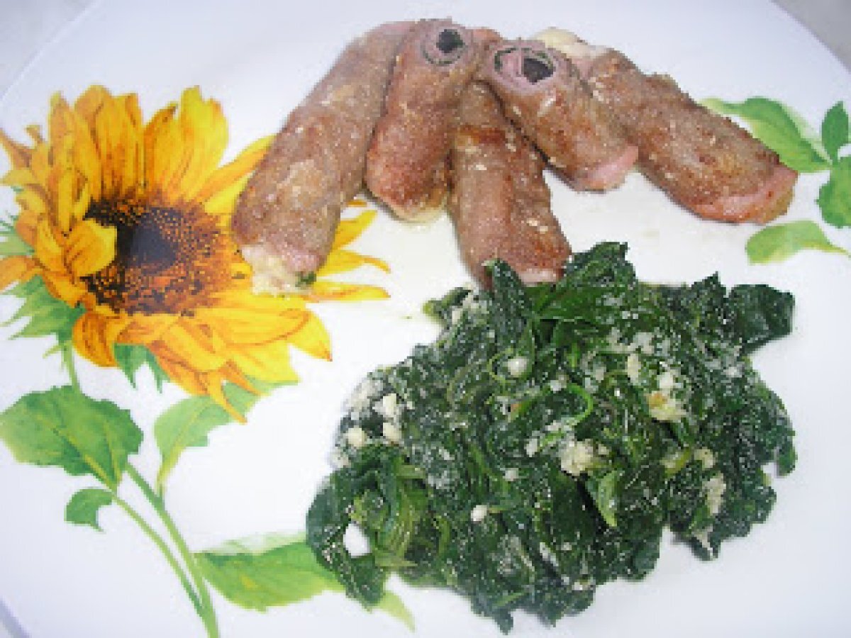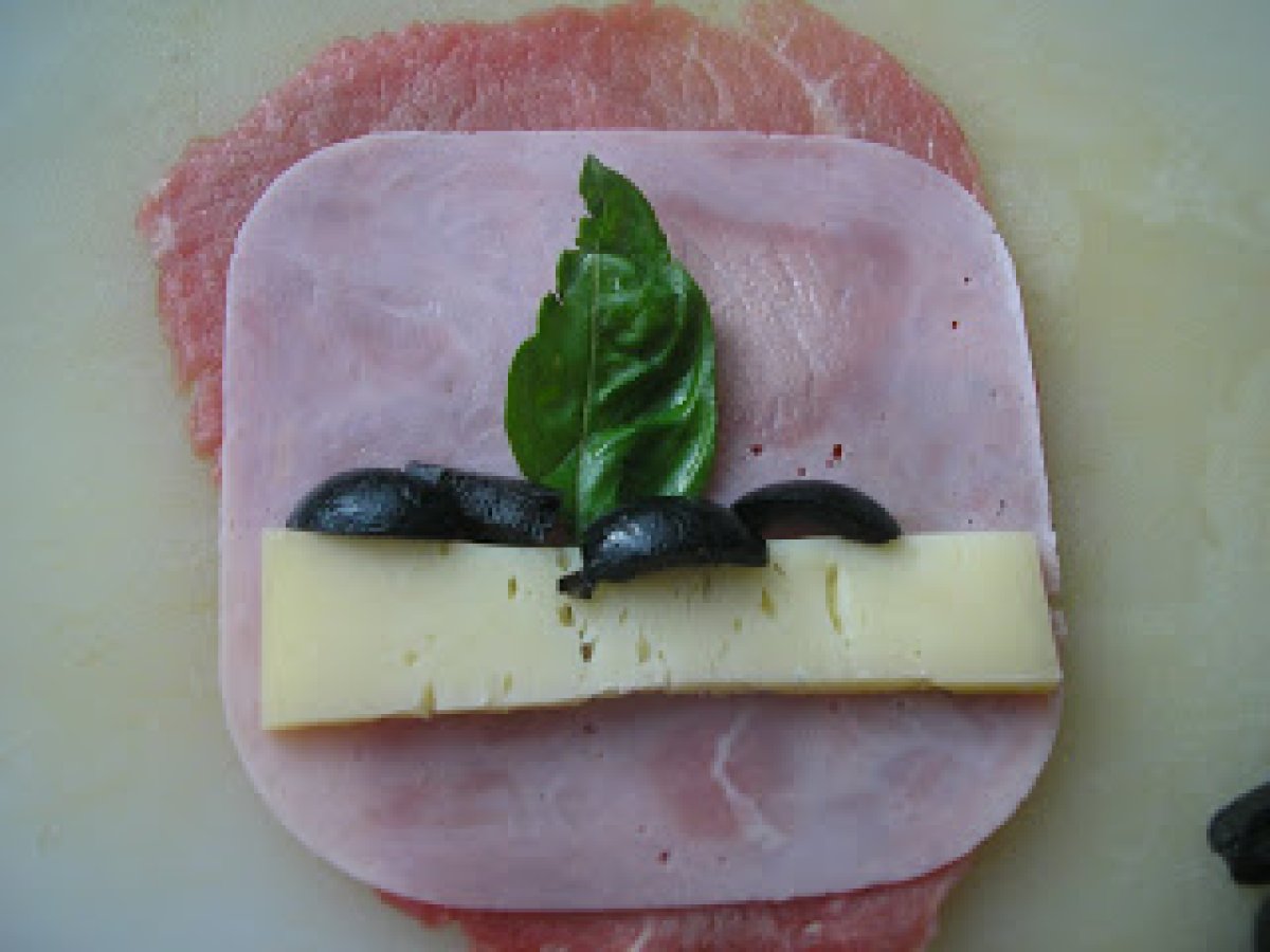 Involtini con prosciutto e formaggio( rulouri cu sunca si branza) PrecedentulUrmătorul Felul principalFoarte ușor25 min Trimite unui prieten Printează pagina Adresează o întrebare autorului Postează o poză cu rețeta gătită de tine Ingrediente 2 fettine di vitello, prosciutto cotto, formaggio tagliato bastoncini, qualche foglia di basilico, olive nere tagliate, 2 cucchiai di farina mischiata con 1 cucchiaio di - sesamo, olio per friggere felii subtiri de carne de vitel, sunca presata, branza taiata bastonase, cateva frunzulite de busuioc, cateva masline negre taiate, 2 linguri de faina amestecata cu 1 lingura de susan, ulei pentru fript