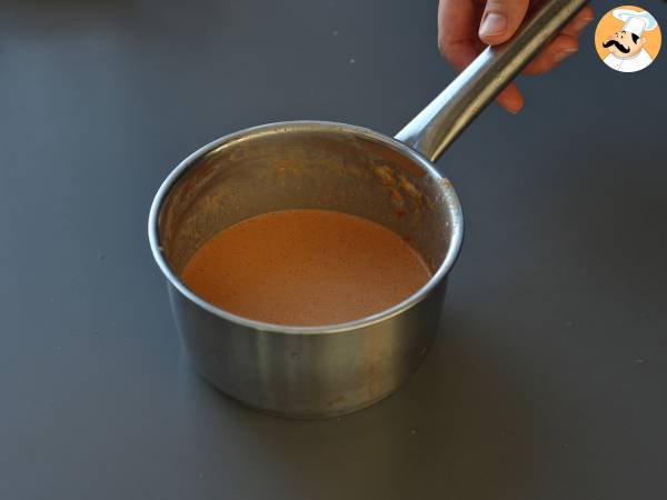 Se pune cratița pe foc și se aduce la fierbere. Se amestecă ocazional cu un tel pentru a preveni lipirea sosului. Se ia de pe foc când sosul s-a îngroșat.