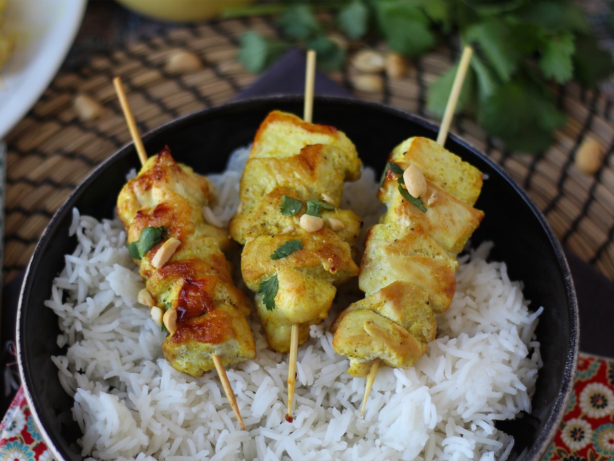 Sunteți gata să călătoriți fără să vă părăsiți bucătăria? Aceste kebab-uri de pui cu sos satay sunt exact ceea ce ai nevoie! Pui fin, marinat într-un amestec de condimente care îți face gura apă doar când te gândești la el, apoi prăjit la perfecțiune :) Și sosul? O mică bombă de aromă cu untul său de arahide, lapte de cocos moale, o atingere de curry roșu pentru a condimenta lucrurile și un strop de lime pentru echilibru. Este cremos, delicios și dă super dependență! Se servește cu puțin orez, câteva alune crocante și puțin coriandru pentru prospețime.