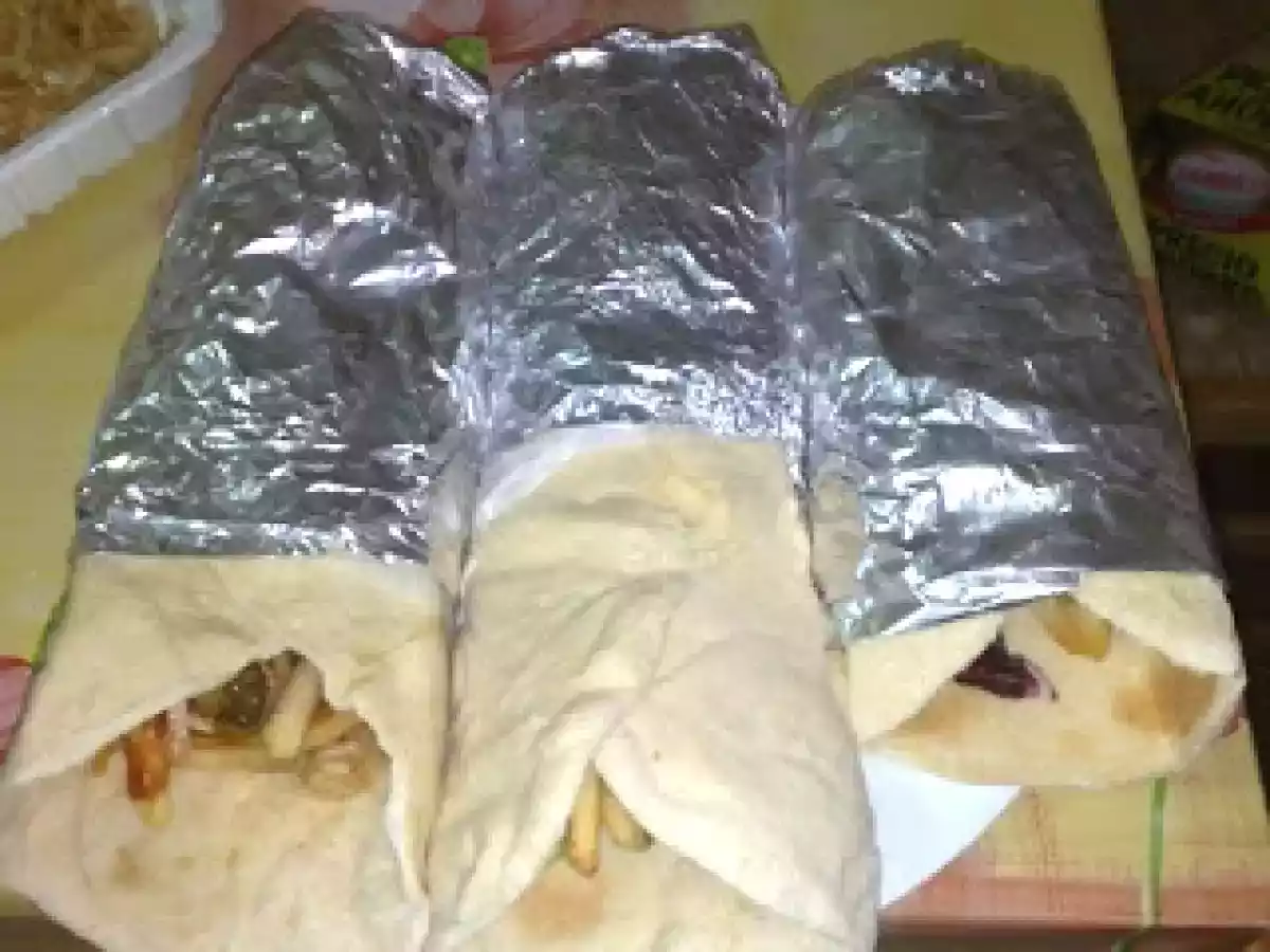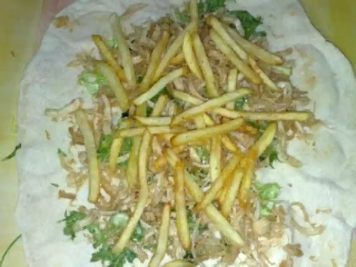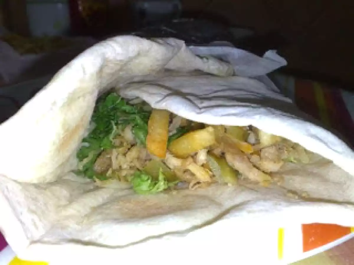 Kebab PrecedentulUrmătorul Felul principalFoarte ușor50 min Trimite unui prieten Printează pagina Adresează o întrebare autorului Postează o poză cu rețeta gătită de tine Ingrediente 4 lipie(vezi reteta lipie pt kebab) piept de pui cartofi prajiti cascaval ras castraveciori acri salata ketchup sare si piper