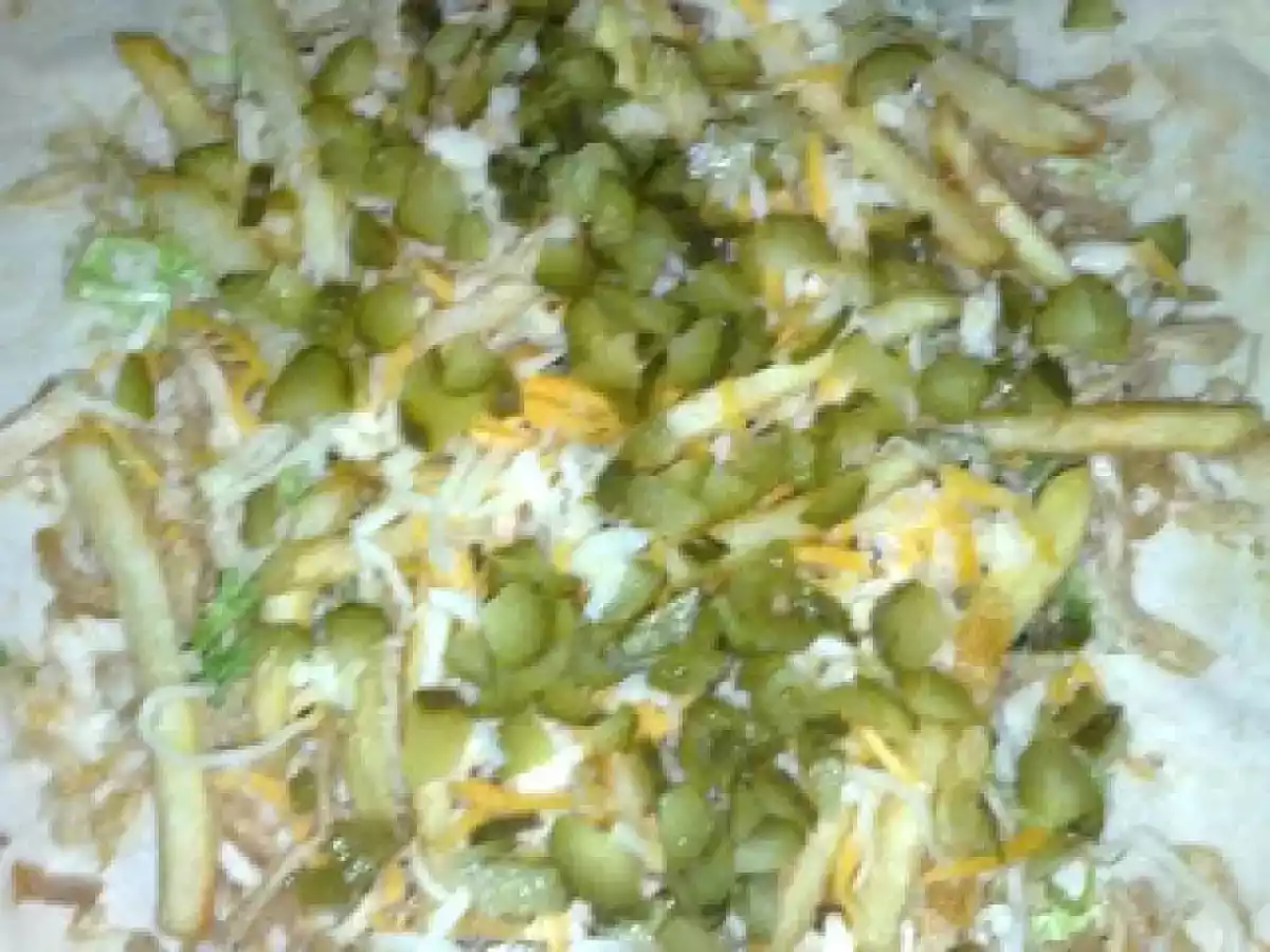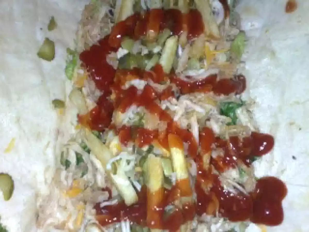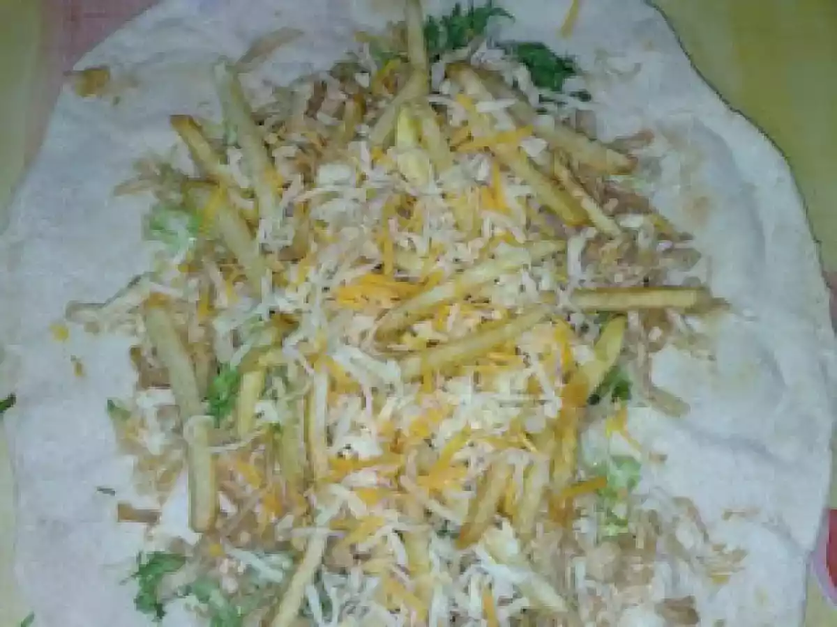 Kebab PrecedentulUrmătorul Felul principalFoarte ușor50 min Trimite unui prieten Printează pagina Adresează o întrebare autorului Postează o poză cu rețeta gătită de tine Ingrediente 4 lipie(vezi reteta lipie pt kebab) piept de pui cartofi prajiti cascaval ras castraveciori acri salata ketchup sare si piper
