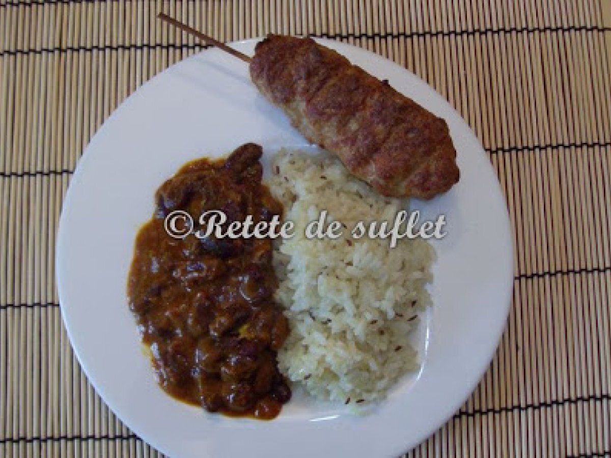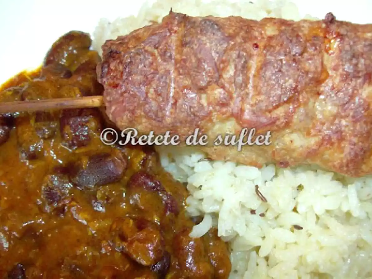 Kebab indian cu fasole rolie si orez PrecedentulUrmătorul Felul principalFoarte ușor2 ore Trimite unui prieten Printează pagina Adresează o întrebare autorului Postează o poză cu rețeta gătită de tine O alternativa aromata a traditionalelor chiftele Ingrediente 8 Pentru kebab 600 g carne, tocata (pui, miel, vita) 1 ou, usor batut 1 ceapa mica, rasa fin 4 catei mici de usturoi, rasi fin 1 lingurita praf coriandru cate 1/2 lingurita de: chimen praf, chilli praf, Garam Masala sare, dupa gust pesmet (cam 100 g) 6 tepuse pentru frigarui Pentru garnitura de fasole 2 cutii mici (sau una mare) de fasole rosie la conserva 3 cm ghimbir, ras fin 2 catei de usturoi, rasi fin 1 lingurita Garam Masala 1 lingurita turmeric (curcuma) 2 linguri pasta de rosii putina apa 2 linguri ulei (nu de masline) Garnitura de orez 1 cana mare (de ceai) de orez Basmati (cu bobul lung) 2 cani apa 2 linguri ulei 1 lingurita de chimen sare dupa gust