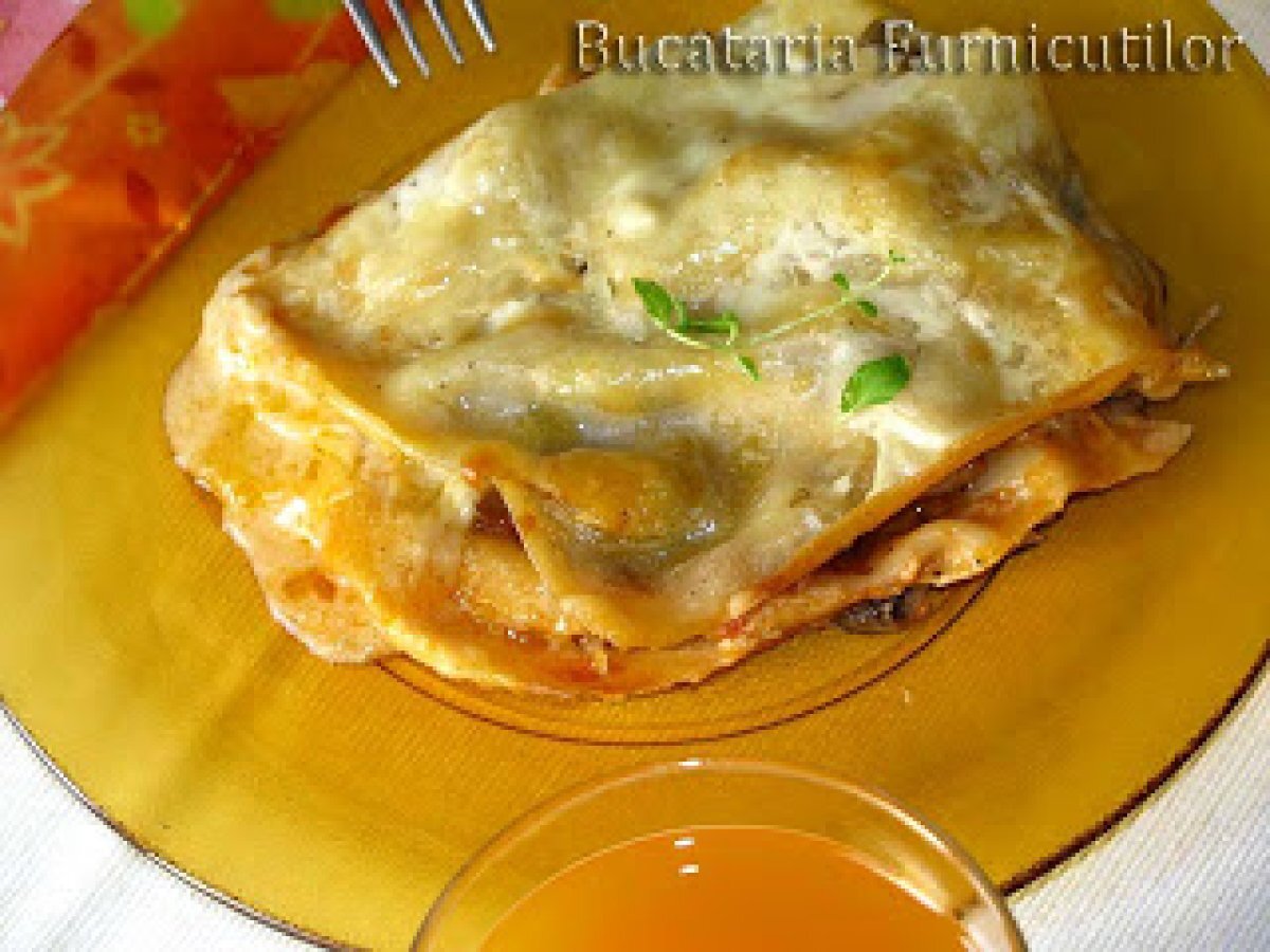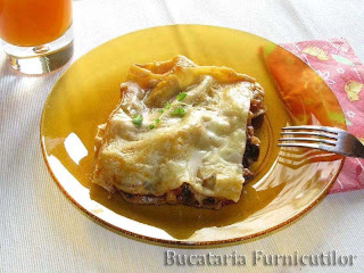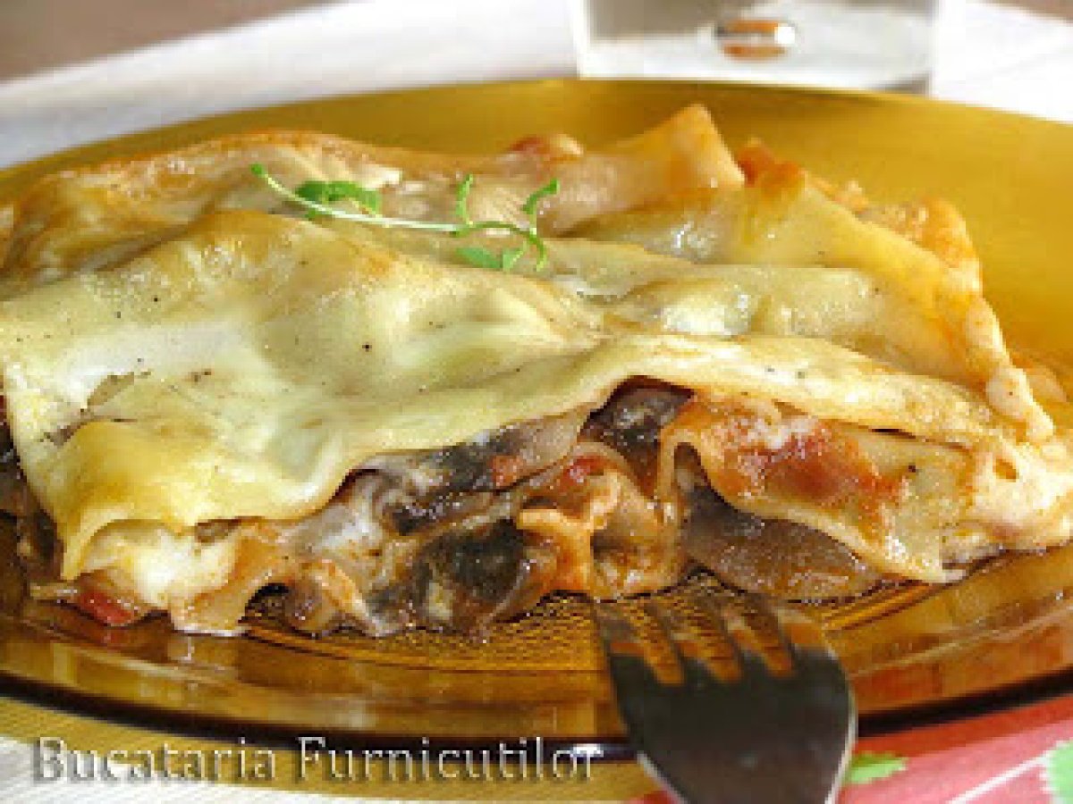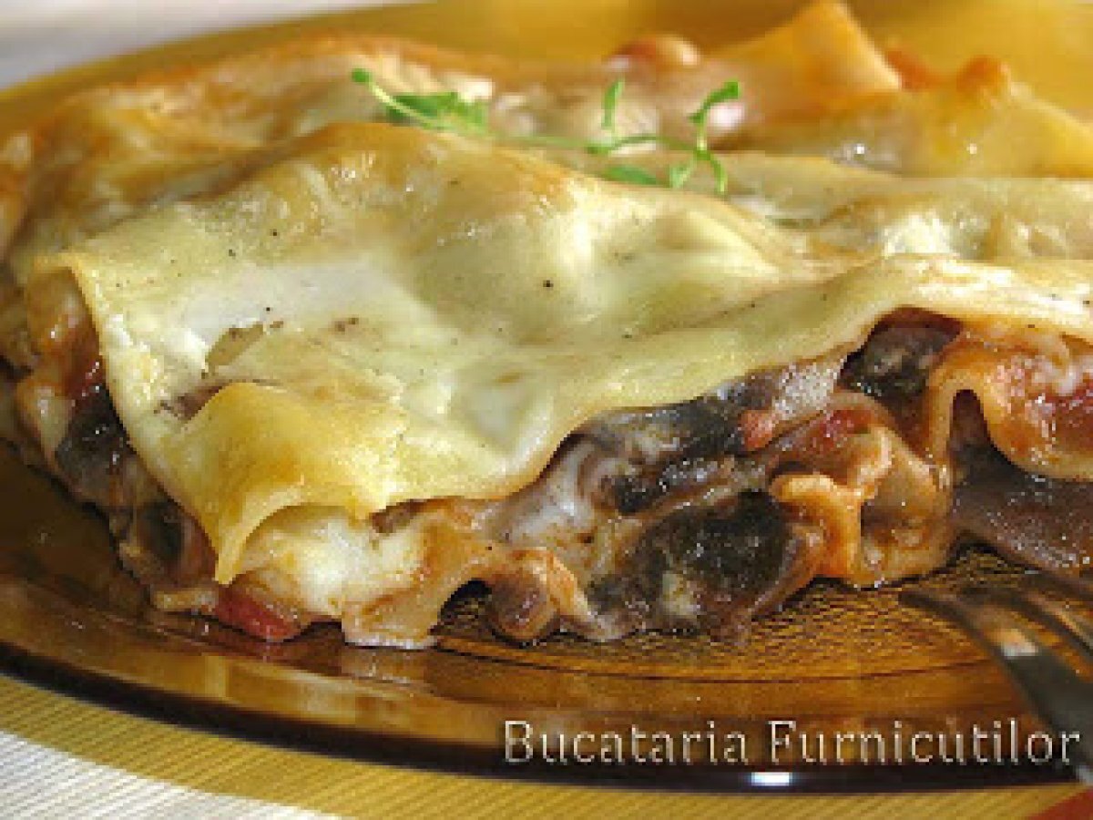 Lasagna cu ciuperci PrecedentulUrmătorul Felul principalFoarte ușor55 min Trimite unui prieten Printează pagina Adresează o întrebare autorului Postează o poză cu rețeta gătită de tine Ingrediente 6 16 foi lasagna 250 g cascaval sau parmezan Sos bechamel: 50 g unt 30 g faina 700 ml lapte 2 - 3 catei de usturoi 500 g ciuperci 1 cutie rosii decojite in bulion 1 ceapa 5 - 6 linguri ulei de masline sare, piper busuioc