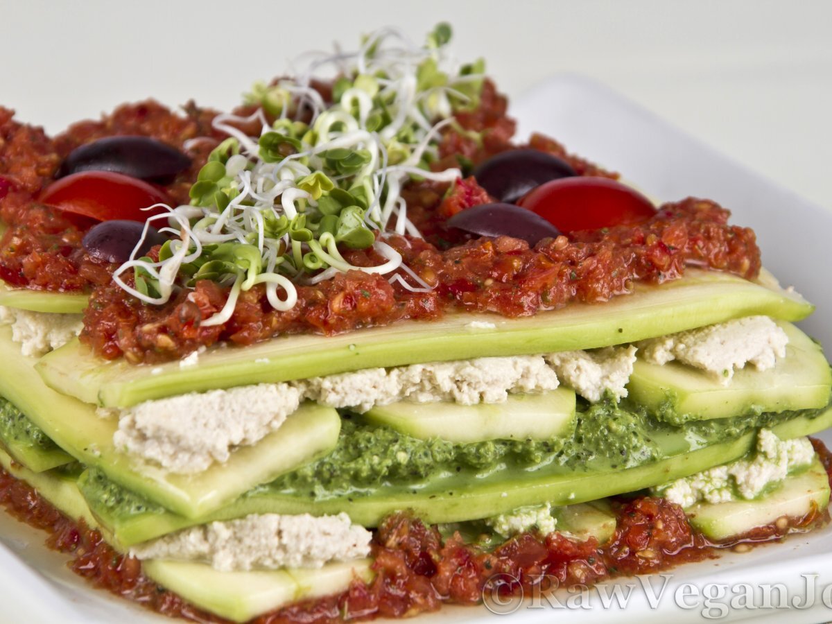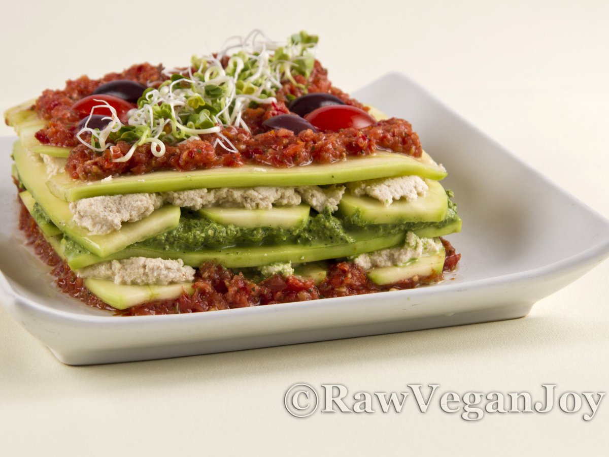 Lasagna (raw vegan) PrecedentulUrmătorul Felul principalFoarte ușor20 min Trimite unui prieten Printează pagina Adresează o întrebare autorului Postează o poză cu rețeta gătită de tine Ingrediente 2 Taitei din dovlecel zucchini 6 dovlecei zucchini mici 1 lingurita sare de Himalaya Dovleceii se curata de coaja si se feliaza subtire cu ajutorul unei mandoline. Se pun feliile intr-un castron, presarate cu sare, si se lasa sa stea cateva ore. Scurgem apa pe care au lasat-o. Branza de caju 2 cani caju hidratate 2-6 ore in apa de izvor 2 linguri zeama de lamaie 2 linguri drojdie inactiva sare de Himalaya dupa gust Se amesteca toate ingredientele in robotul cu lama in S. Sos de rosii 6 rosii cherry 1/2 cana rosii uscate, hidratate 20 minute in apa de izor 1 lingura ulei extra virgin de masline 1 catel de usturoi pisat 1 lingurita oregano uscat 1/2 lingurita busuioc uscat 1/2 lingurita majoran uscat sare de Himalaya dupa gust peperoncini sau chili pepper, dupa gust Se amesteca usor toate ingredientele in robotul cu lama in S. Putem folosi functia puls ca sa ramana bucatiile de rosii mai mari. Sos pesto de busuioc, varianta de iarna 2 cani spanac 2 linguri busuioc uscat maruntit fin 1/2 cana seminte de pin 1 lingura ulei de masline 1 lingura zeama de lamaie sare de Himalaya dupa gust apa de izvor cat este necesar Se amesteca in robotul cu lama in S. Ornare masline Kalamata germeni de ridiche rosie