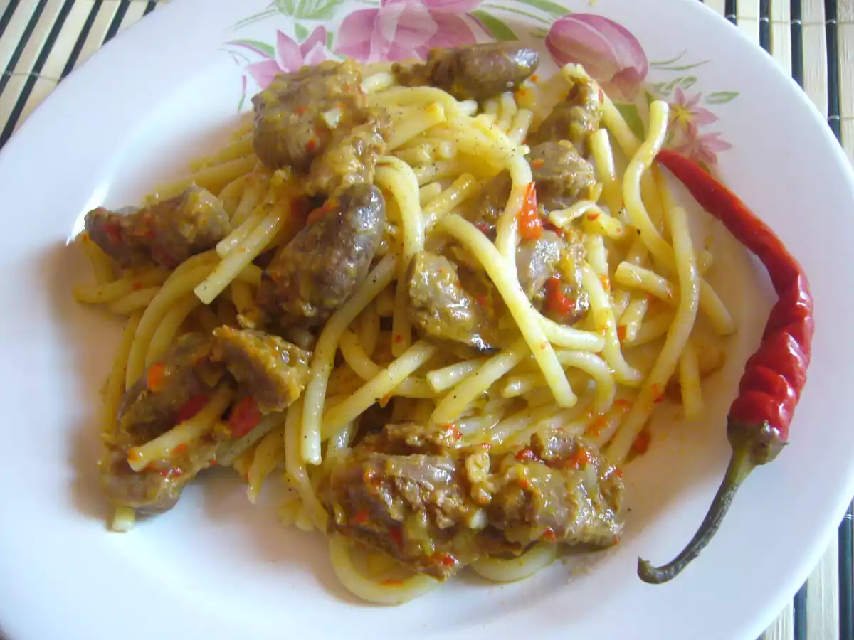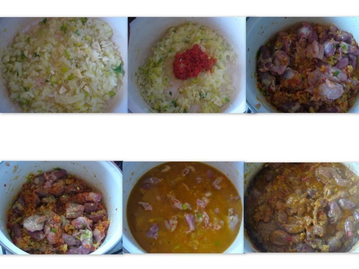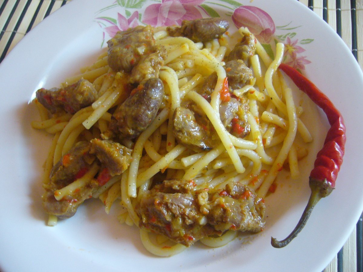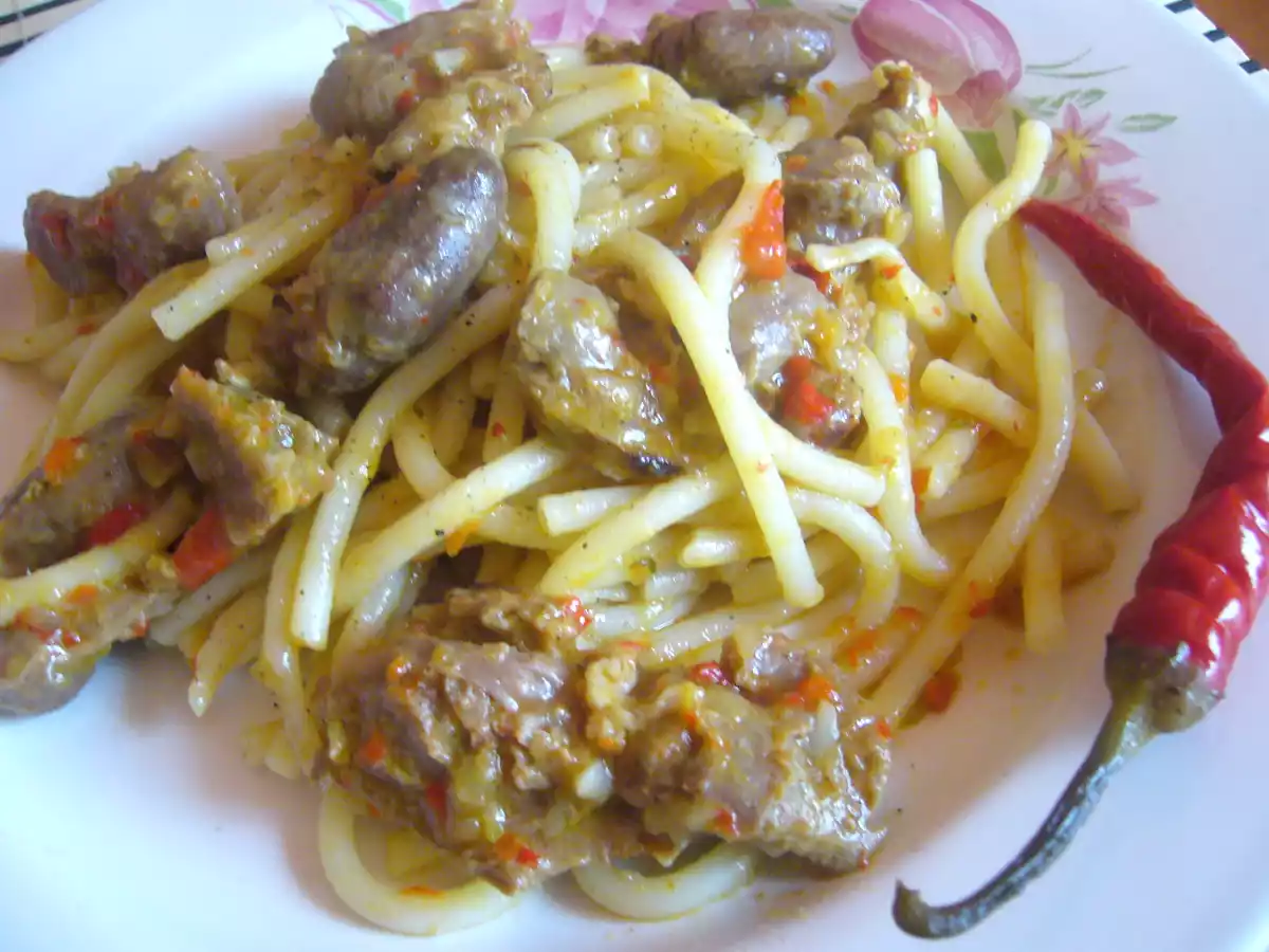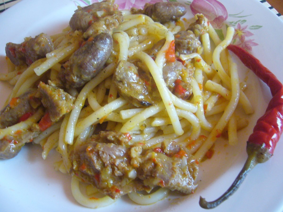 Macaroane cu pipote si inimi usor picant PrecedentulUrmătorul Felul principalUșor1 h 30 m Trimite unui prieten Printează pagina Adresează o întrebare autorului Postează o poză cu rețeta gătită de tine Ingrediente 4 1/2 kg pipote si inimi de pui, 3 cepe mari, 2 catei de usturoi, 1 ardei capia rosu sau pasta de ardei, sare, piper, boia de ardei iute, apa, 3-4 lg de ulei, 400 gr macaroane.