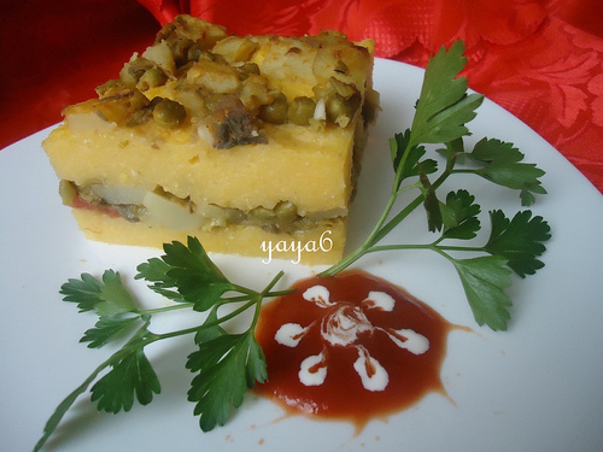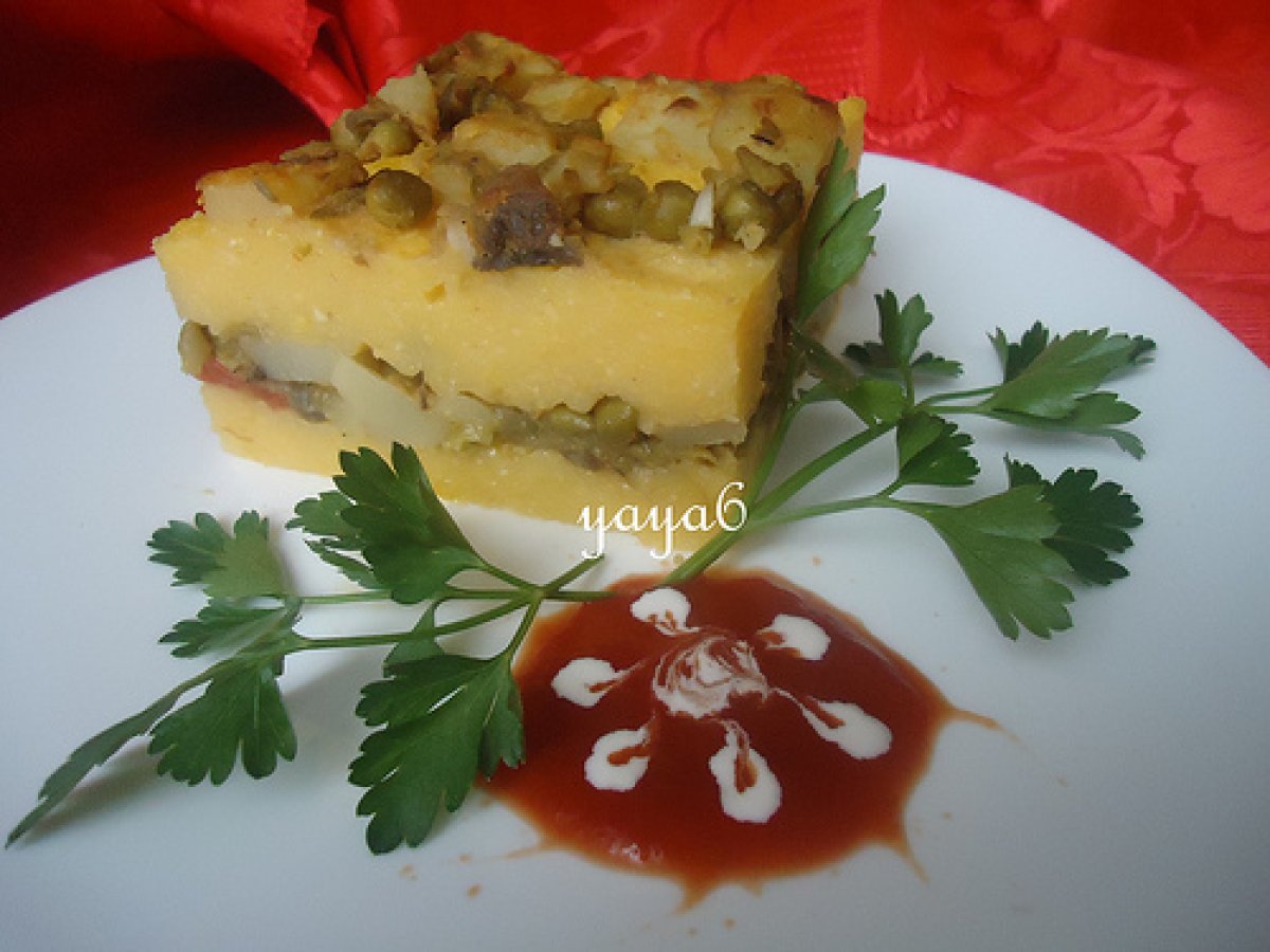 Mamaliga cu "tochitura" de legume PrecedentulUrmătorul Felul principalFoarte ușor35 min Trimite unui prieten Printează pagina Adresează o întrebare autorului Postează o poză cu rețeta gătită de tine Ingrediente 4 o mamaliga moale, moale, o ceapa, un catel de usturoi, mazare,cartofi, rosii, pastai, sare,piper,ciuperci