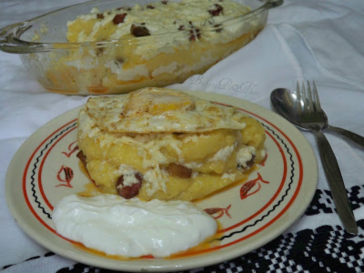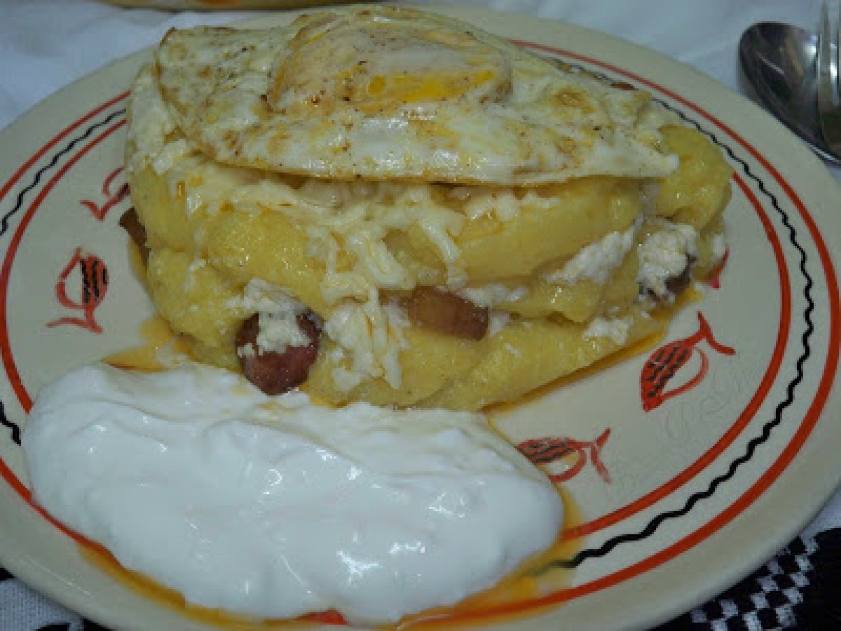 Mamaliga impaturita PrecedentulUrmătorul Felul principalFoarte ușor35 min Trimite unui prieten Printează pagina Adresează o întrebare autorului Postează o poză cu rețeta gătită de tine Ingrediente 4 1.5 l apa 500 g faina de malai 200 g slanina 200 g carnat 250 g branza de burduf 200 g telemeasarepentru