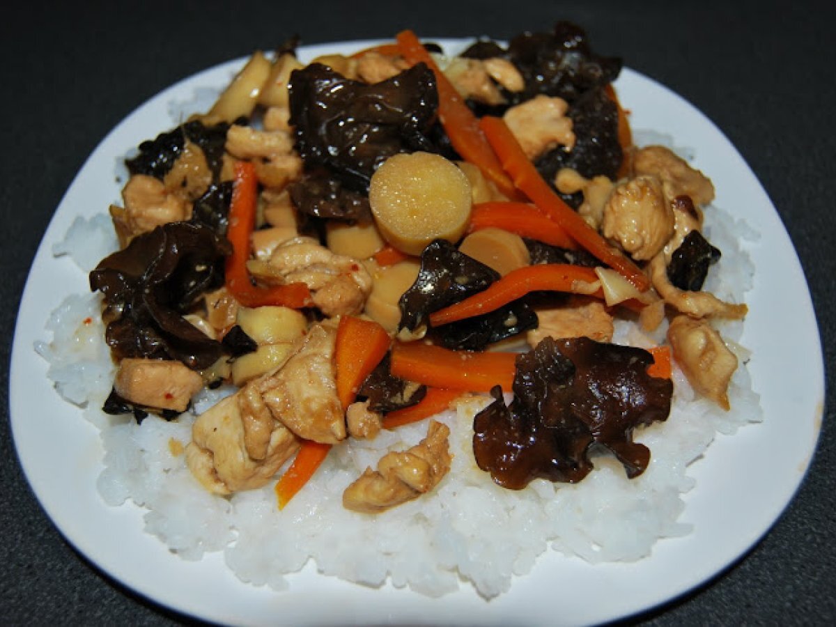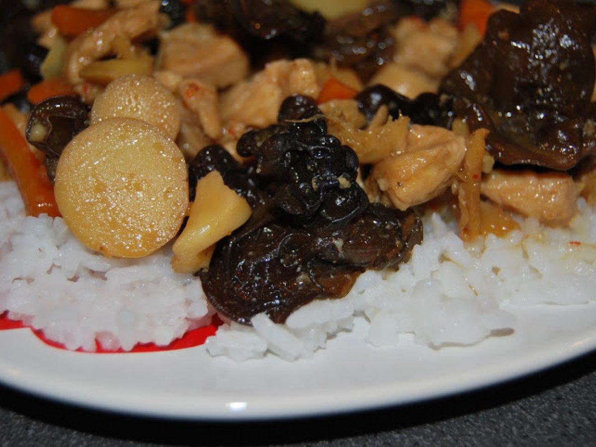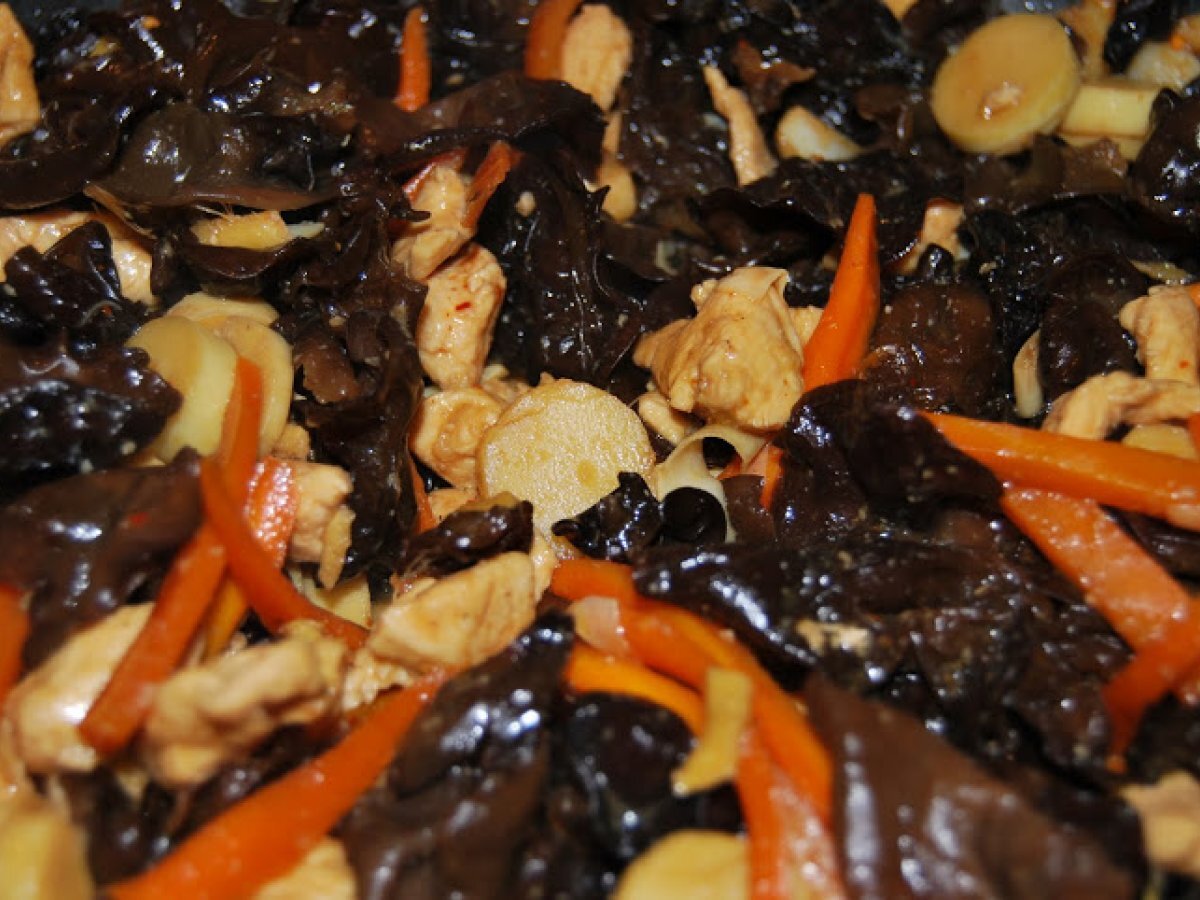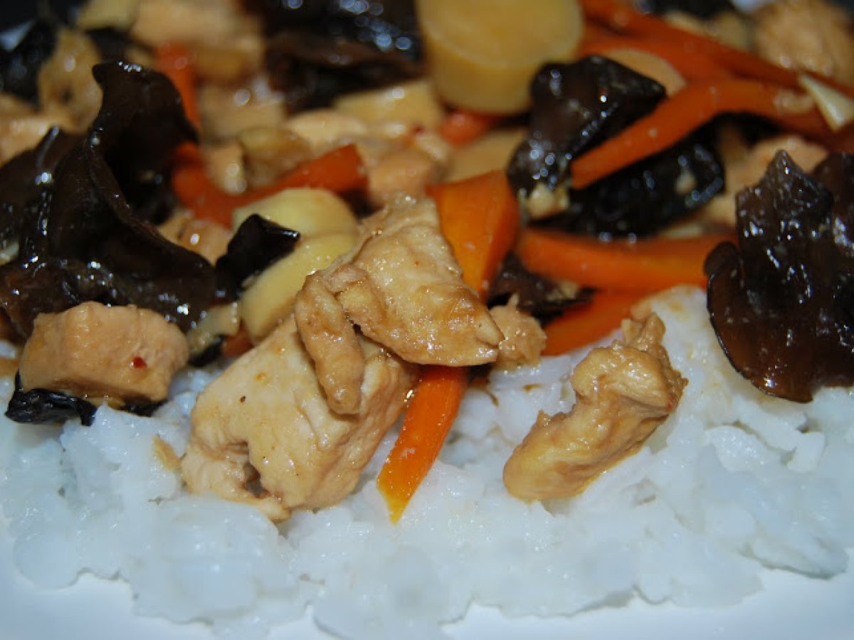 Mancare chinezeasca PrecedentulUrmătorul Felul principalFoarte ușor45 min Trimite unui prieten Printează pagina Adresează o întrebare autorului Postează o poză cu rețeta gătită de tine Ingrediente 6 5 catei de usturoi 2 cm de ghimbir 50 ml ulei 1 piept de pui 1 lingura cu varf de amidon de cartofi 2 morcovi 1 mana de ciuperci negre chinezesti 1 borcan de muguri de bambus 1 praz sos de soia condiment (ardei iute, piper rosu, arahide)