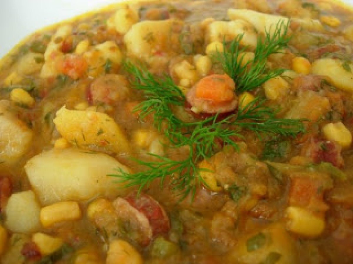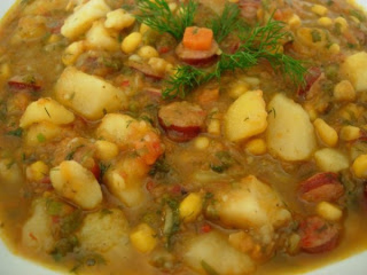 Mancare de cartofi cu porumb si carnati PrecedentulUrmătorul Felul principalFoarte ușor1 h 25 m Trimite unui prieten Printează pagina Adresează o întrebare autorului Postează o poză cu rețeta gătită de tine Ingrediente 5 500 g cartofi 1 conserva boabe de porumb 250 g carnaciori afumati 2 morcovi 1 telina 1 pastarnac 1 ceapa 1 lingura ulei 1 legatura frunze de patrunjel tocat 1 legatura frunze de marar tocat Sare Piper ½ lingurita chimen macinat ½ lingurita tarhon uscat