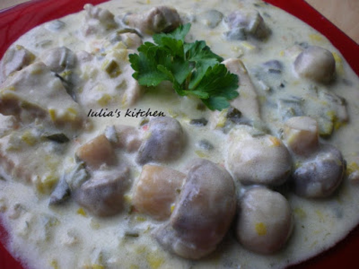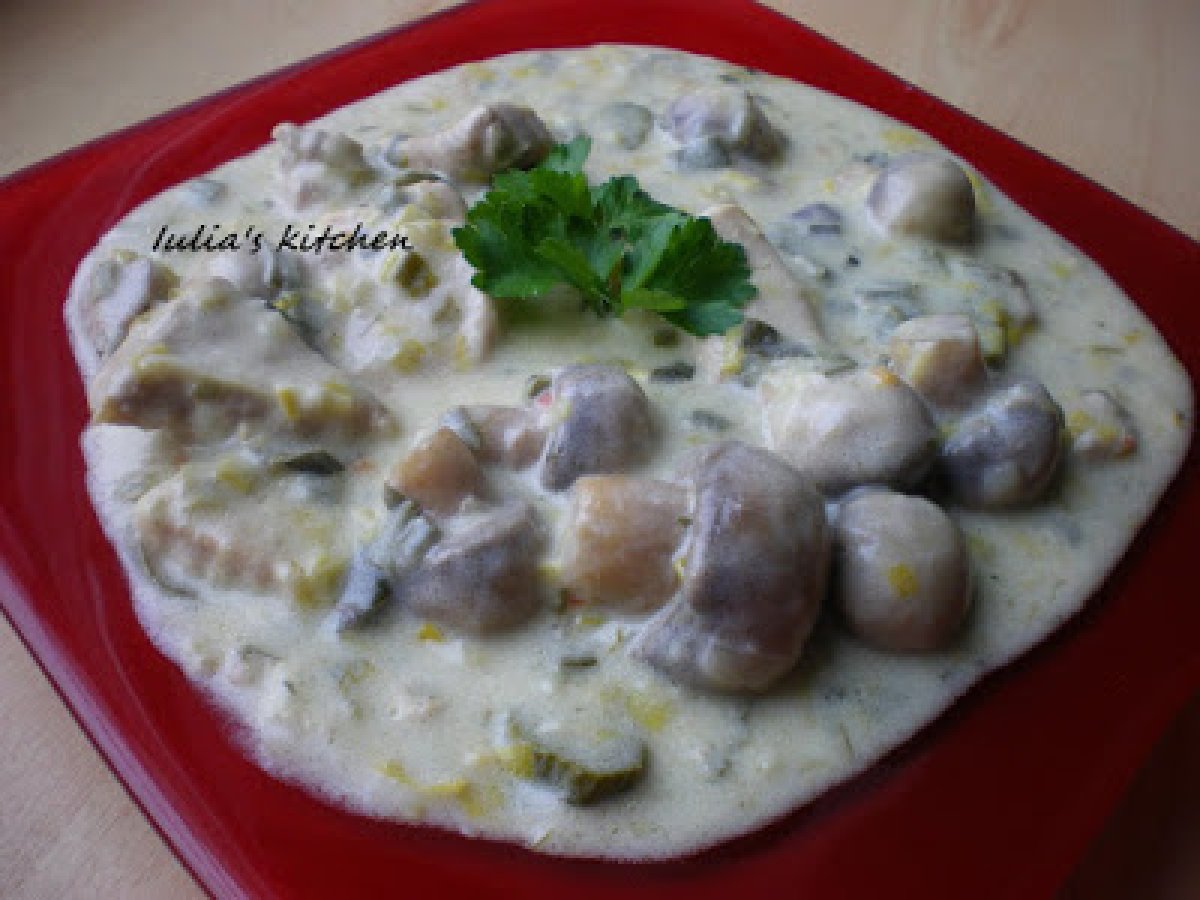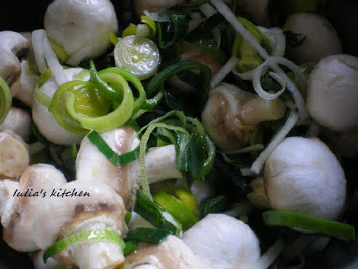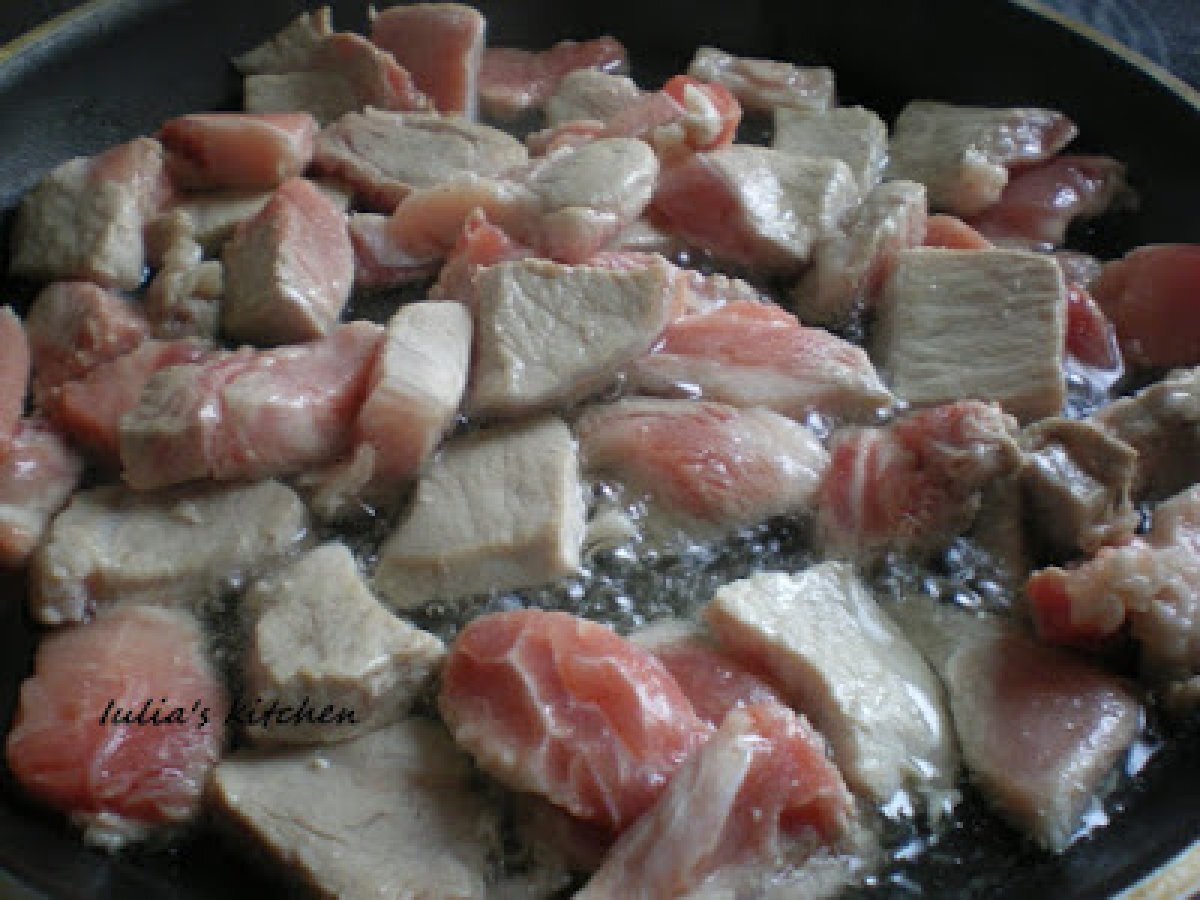 Mancare de ciuperci cu praz si carne de porc PrecedentulUrmătorul Felul principalFoarte ușor35 min Trimite unui prieten Printează pagina Adresează o întrebare autorului Postează o poză cu rețeta gătită de tine Ingrediente 2 500 g ciuperci 1 praz 500g carne de porc 2 linguri ulei 2 linguri de faina 300 g smantana supa de legume 6 castraveti murati sare,piper.
