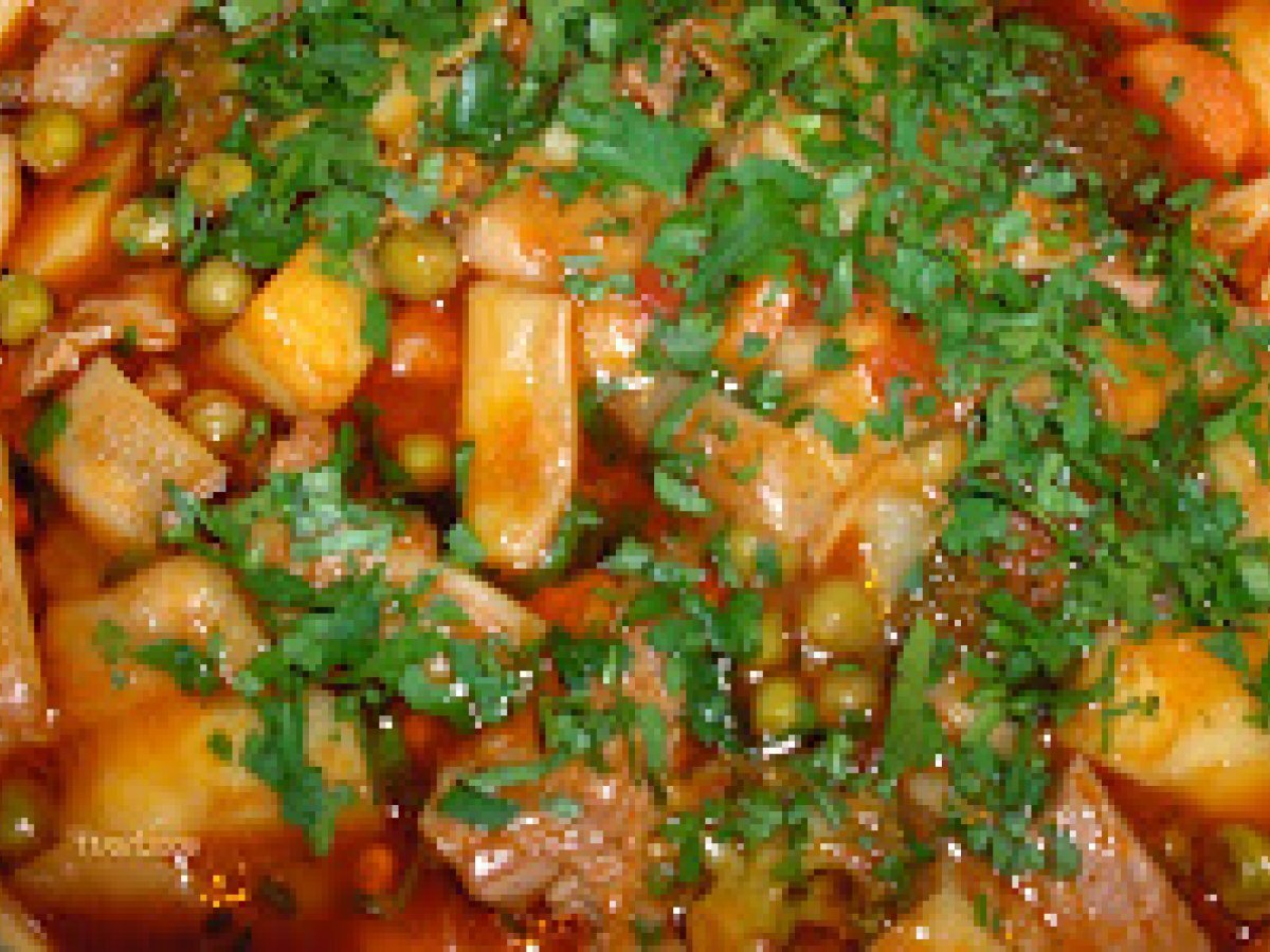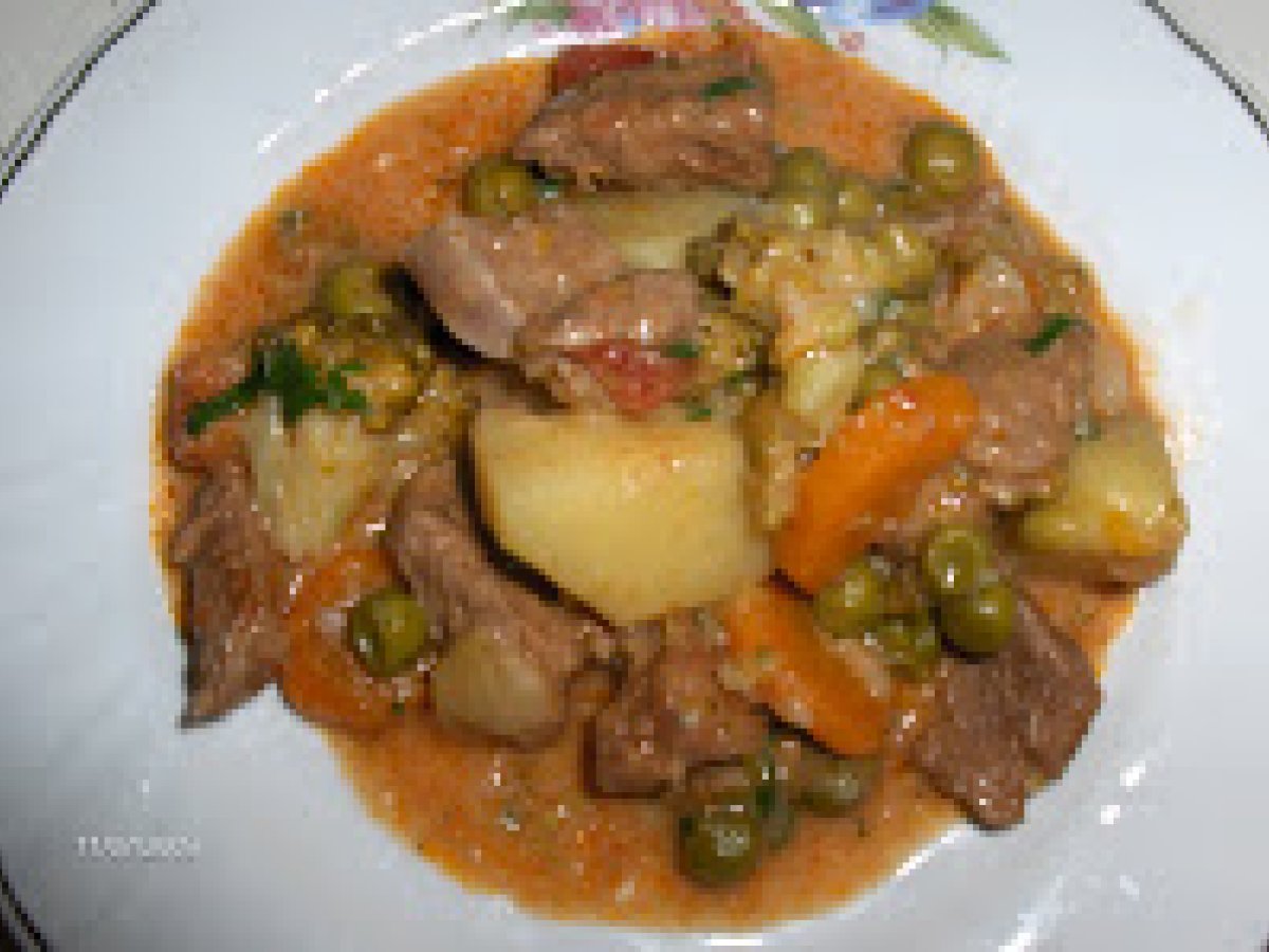 Mancare de legume cu carne de vita PrecedentulUrmătorul Felul principalFoarte ușor1 h 45 m Trimite unui prieten Printează pagina Adresează o întrebare autorului Postează o poză cu rețeta gătită de tine Ingrediente 2 vrabioara de vacuta(manzat) 600 g o lingura de faina; 2 cartofi mari, 2 cepe 1 morcove 1 mana buna de mazare o mana de fasole verde brocoli ardei gras 2 linguri de suc de rosii 2 cani cu supa boia dulce ulei, patrunjel galbenus+250 g smantana sare si piper