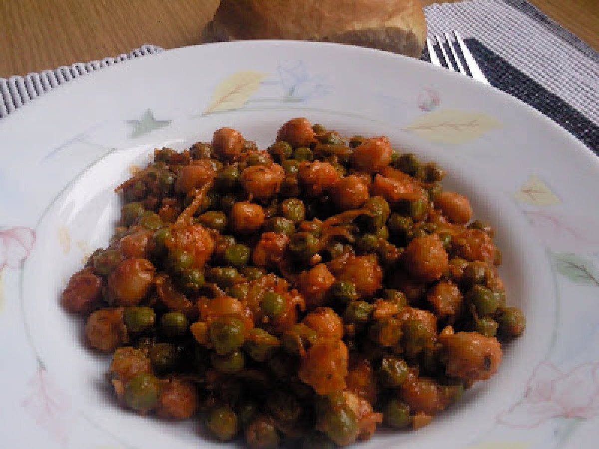 Mancare de naut si mazare / guiso de garbanzo y guisantes PrecedentulUrmătorul Felul principalFoarte ușor1 oră Trimite unui prieten Printează pagina Adresează o întrebare autorului Postează o poză cu rețeta gătită de tine Ingrediente 4 250 g mazare congelata 200 g naut fiert 300 g pasta de rosii 1 ceapa 2 graunti de usturoi 4-5 linginuri ulei de masline 1 foaie de dafin 1 lingurita cimbru 1/2 lingurita oregano sare dupa gust