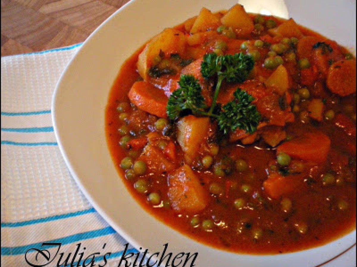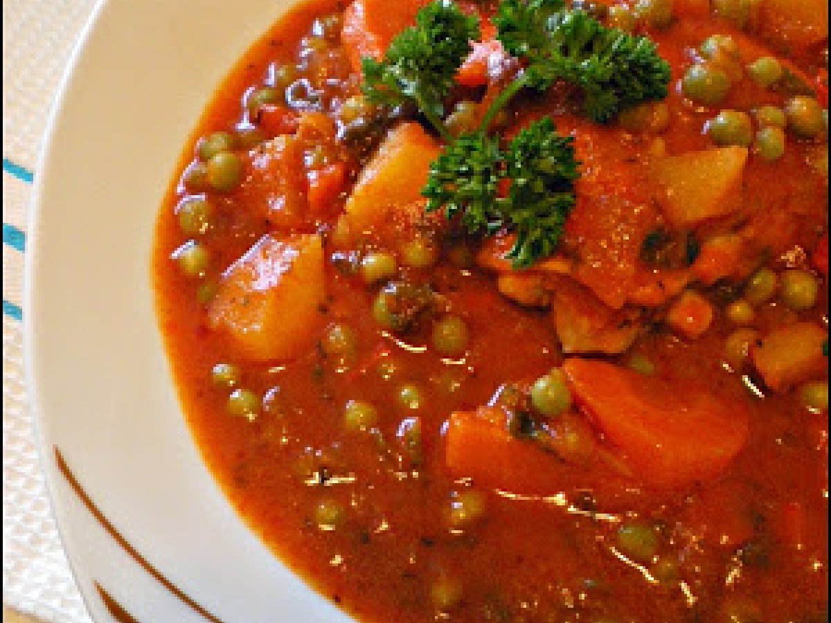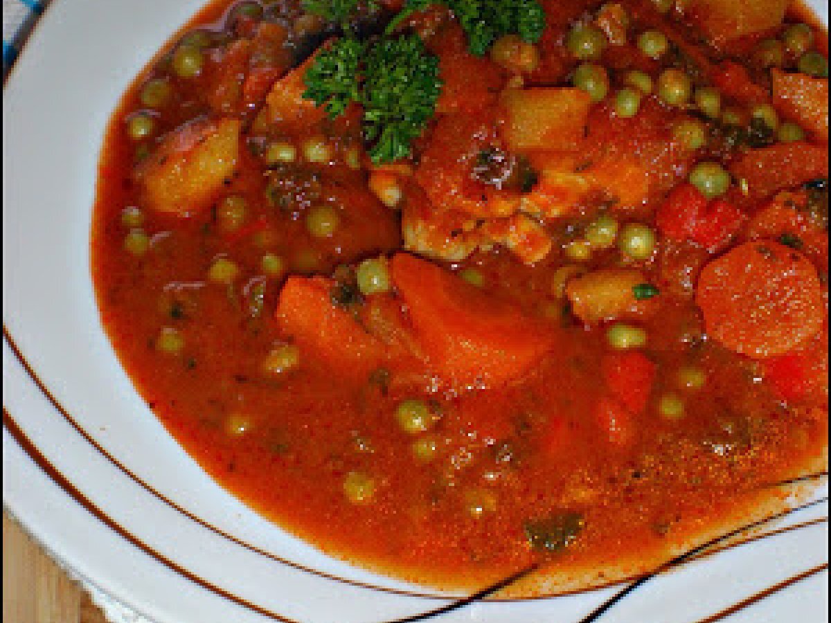 Mancare de pui si legume PrecedentulUrmătorul Felul principalFoarte ușor45 min Trimite unui prieten Printează pagina Adresează o întrebare autorului Postează o poză cu rețeta gătită de tine Ingrediente 4 3 pulpe de pui 3 morcovi 1 ceapa 1 ardei gras 7-8 cartofi 1 conserva mazare 2 linguri pasta de tomate 1/2 pahar vin patrunjel verde sare, piper cimbru verdeturi a la Provence.