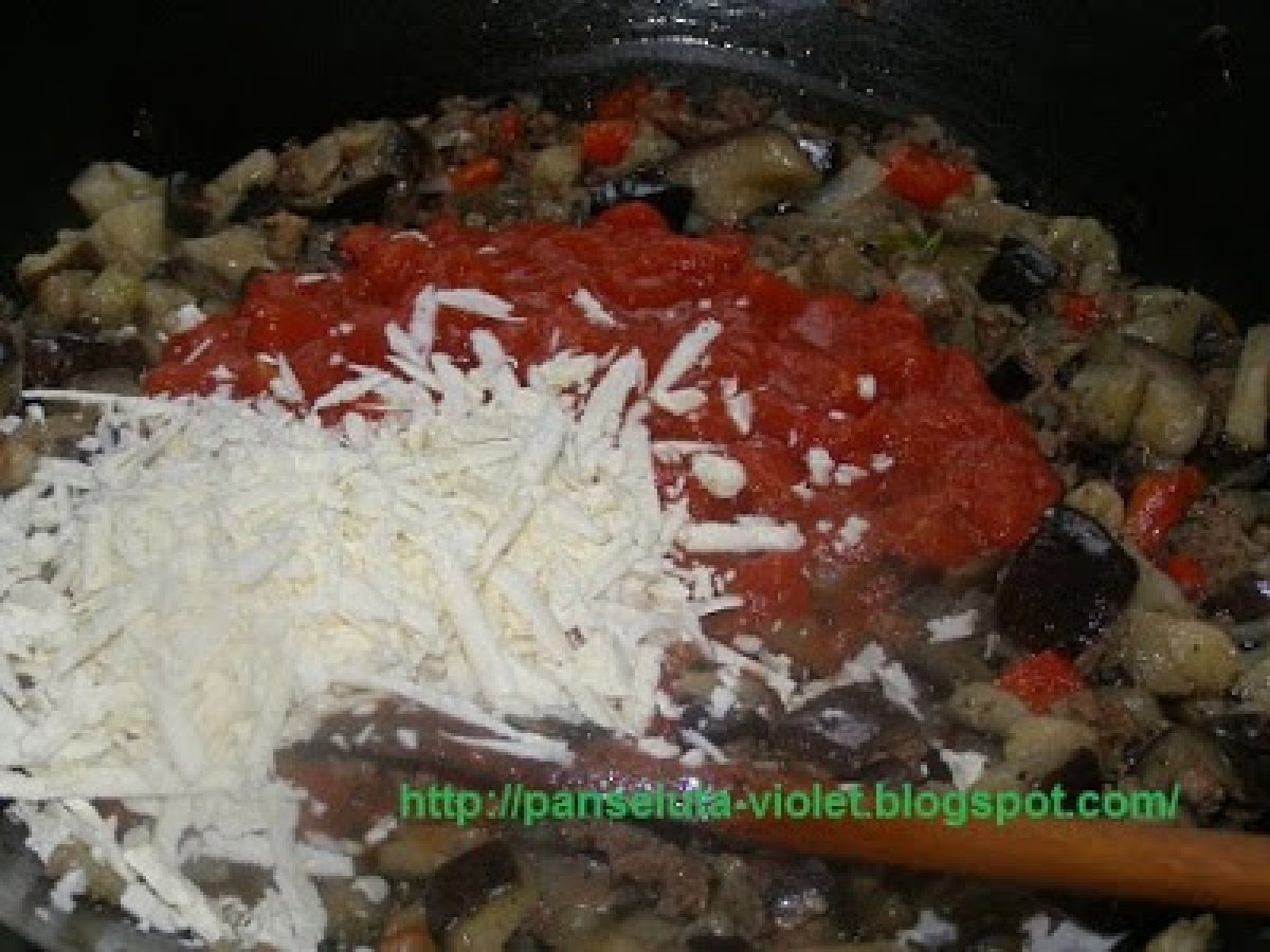 Mancare de vinete cu carne de vaca PrecedentulUrmătorul Felul principalFoarte ușor50 min Trimite unui prieten Printează pagina Adresează o întrebare autorului Postează o poză cu rețeta gătită de tine Ingrediente 8 3 vinete marisoare.cam 1,5 kg 0,5 kg carne tocata de vita 1 ceapa mare taiata solzisori 4 catei de usturoi maruntiti 1 ardei rosu taiat cubulete 2 conserve de rosii decojite,taiate cubulete 3-4 Lg (linguri) pasta de tomate 0,300 g telemea rasa ulei sare,piper,ardei iute busuioc verde sau uscat,menta,patrunjel