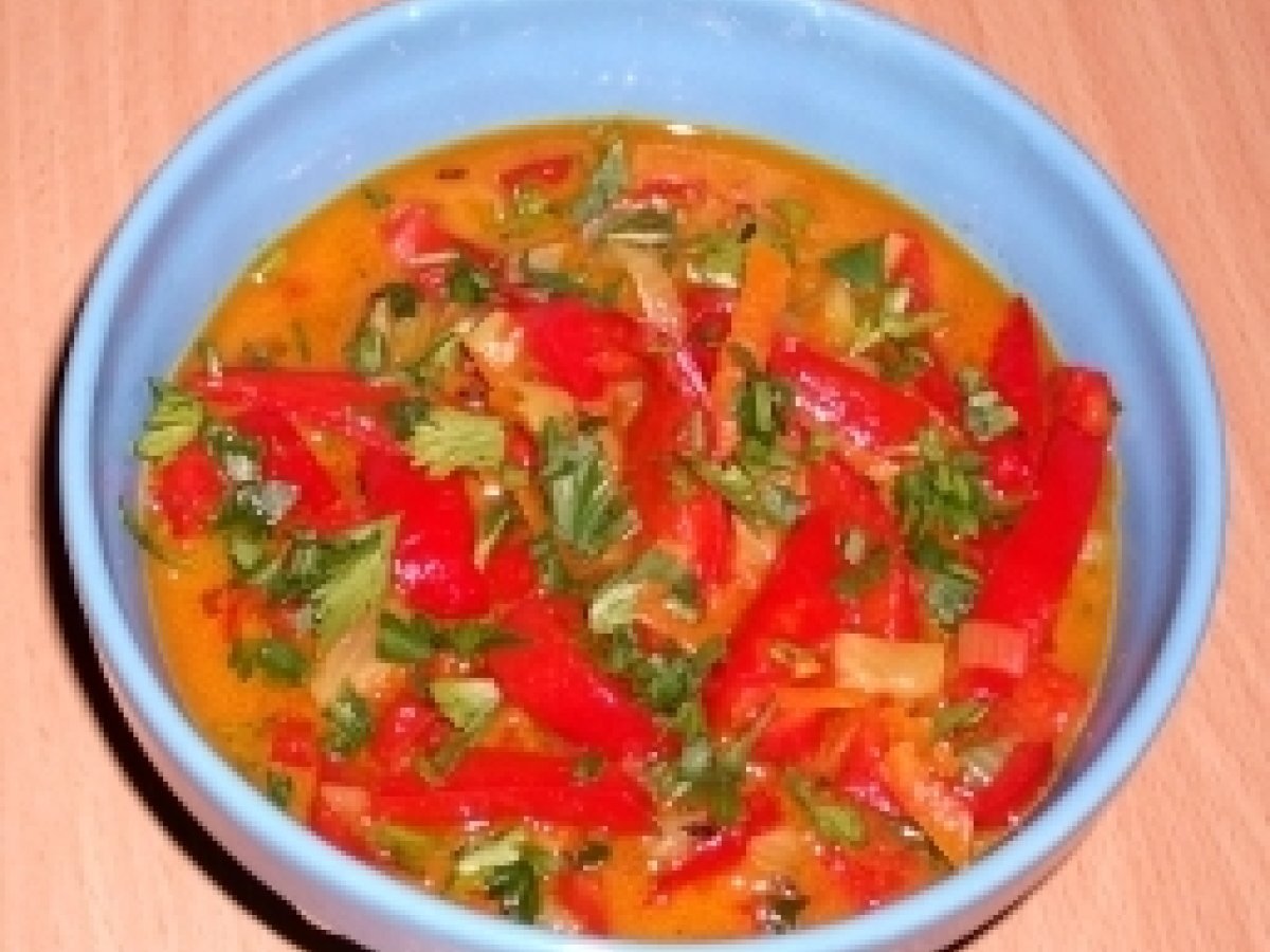 Mancare indiana de ardei capia Felul principalUșor30 min Trimite unui prieten Printează pagina Adresează o întrebare autorului Postează o poză cu rețeta gătită de tine Ingrediente 3 5 ardei capia 1 morcov 1 bucata de praz cat un deget 1 ceapa mica 1 bucatica ghimbir proaspat 1 lingurita seminte chimen 1 lingurita coriandru macinat 1 lingurita fenicul macinat 1/2 lingurita turmeric 4 linguri ulei de masline (pomace e ok) 500 ml apa 1/4 lingurita sare patrunjel verde tocat