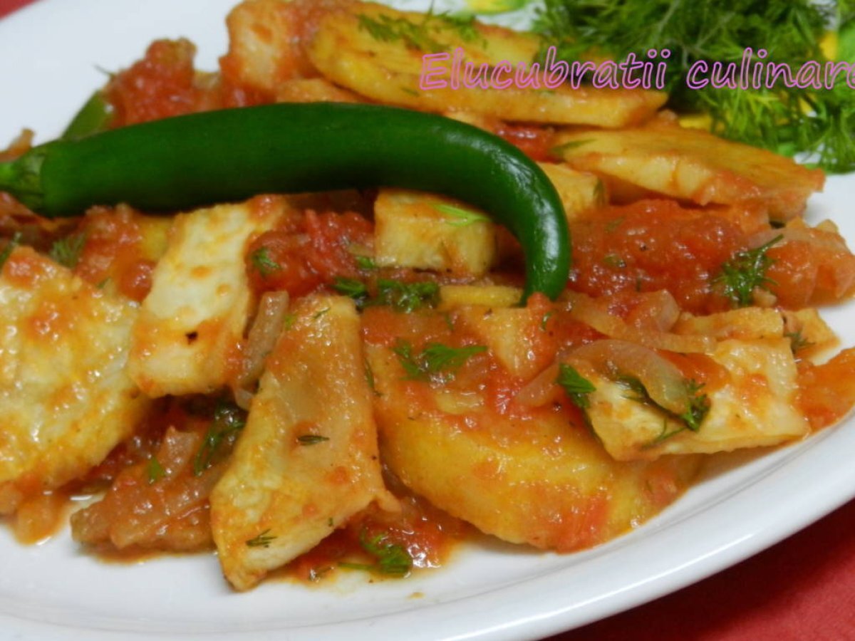 Mâncare picantă de cartofi cu țelină - de post Felul principalFoarte ușor45 min Trimite unui prieten Printează pagina Adresează o întrebare autorului Postează o poză cu rețeta gătită de tine Ingrediente 4 500 g cartofi, 500 g țelină, 2 cepe, 50 ml ulei, 1 linguriță praf chilli, 2 ardei iuți verzi, o conservă cu roșii, o legătură mărar, sare, piper.