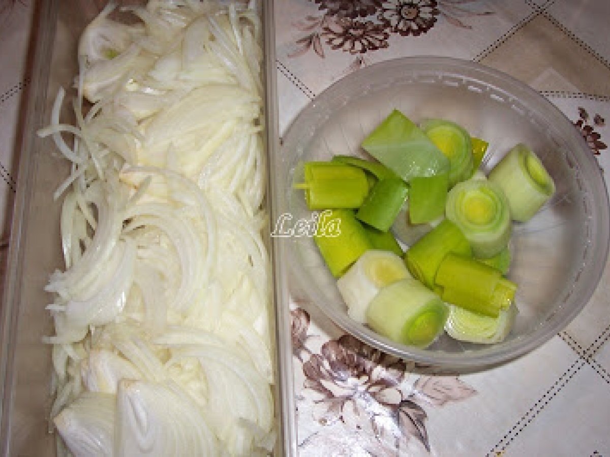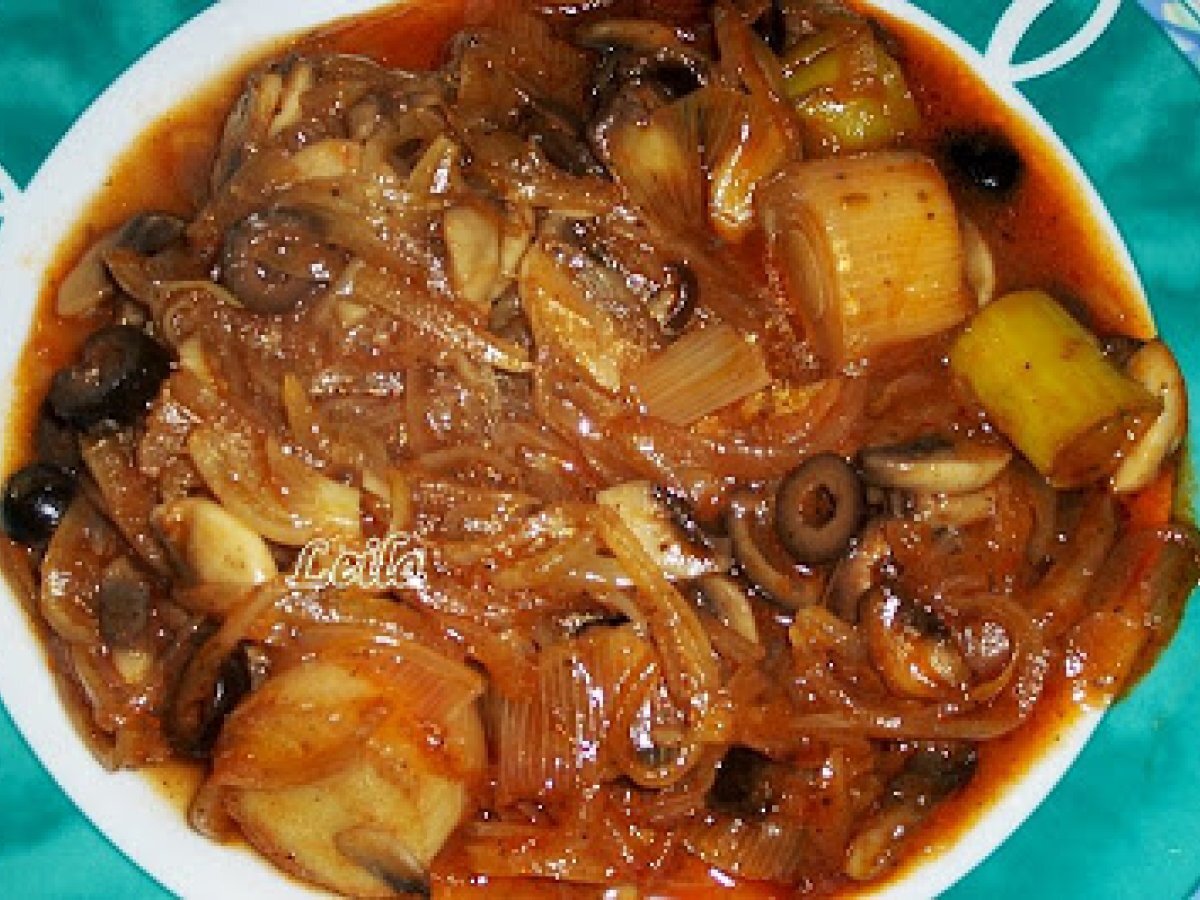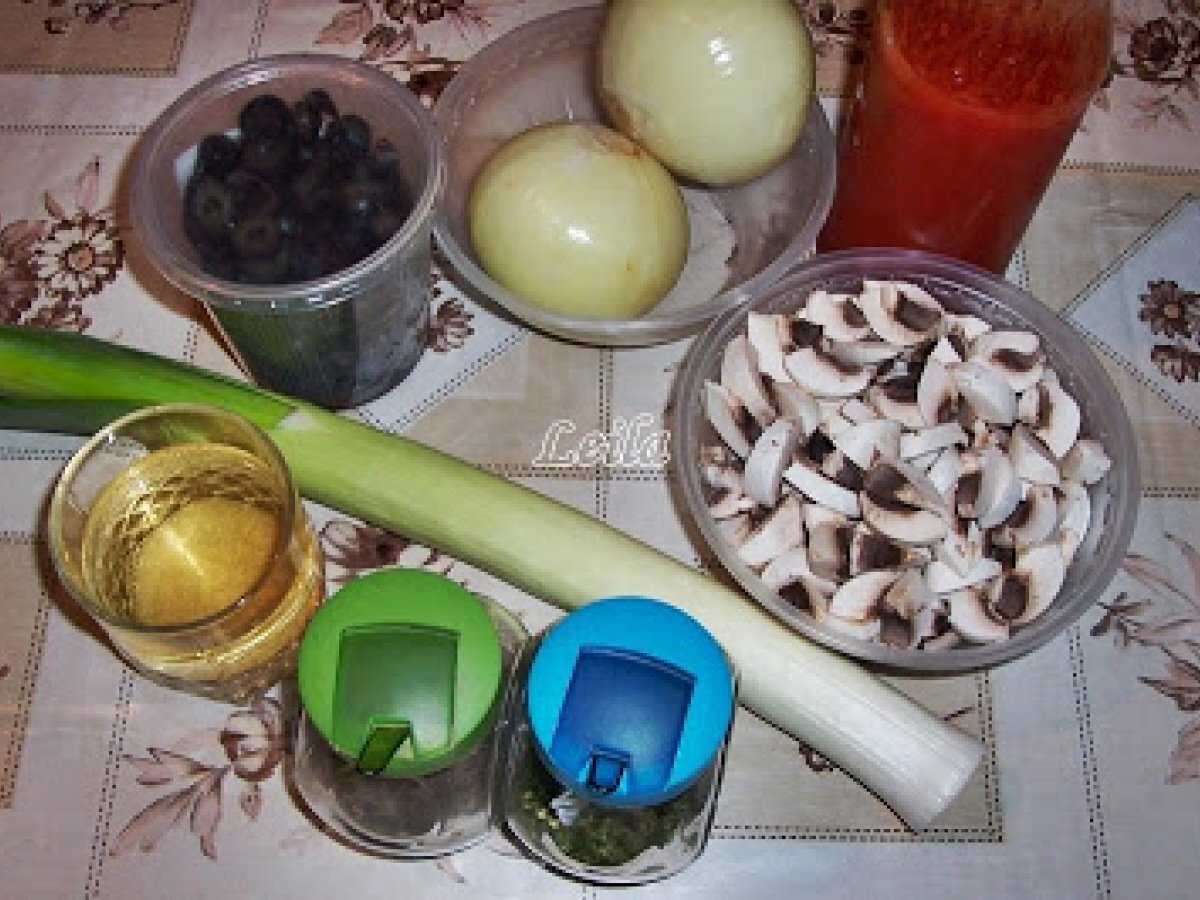 Mancarica cu praz , masline si ciuperci PrecedentulUrmătorul Felul principalFoarte ușor50 min Trimite unui prieten Printează pagina Adresează o întrebare autorului Postează o poză cu rețeta gătită de tine Ingrediente 2 1 fir praz 2 bucati ceapa alba 150 ml vin alb demisec 200 ml bulion 200 ml apa 150 g masline negre feliate 200 g ciuperci champignon 100 ml ulei sare, piper dupa gust marar verde sau uscat , dupa gust