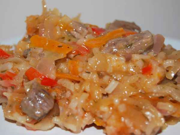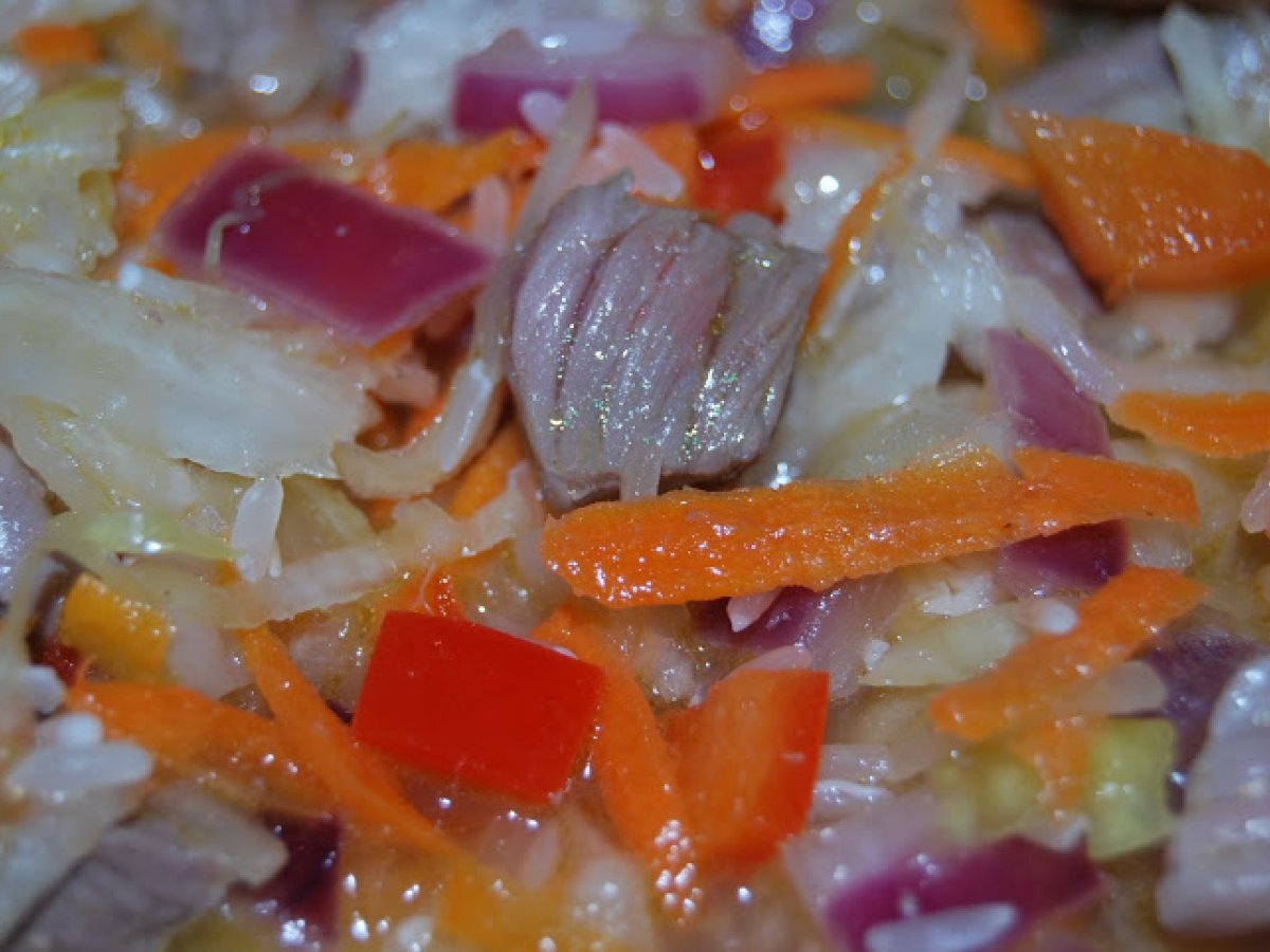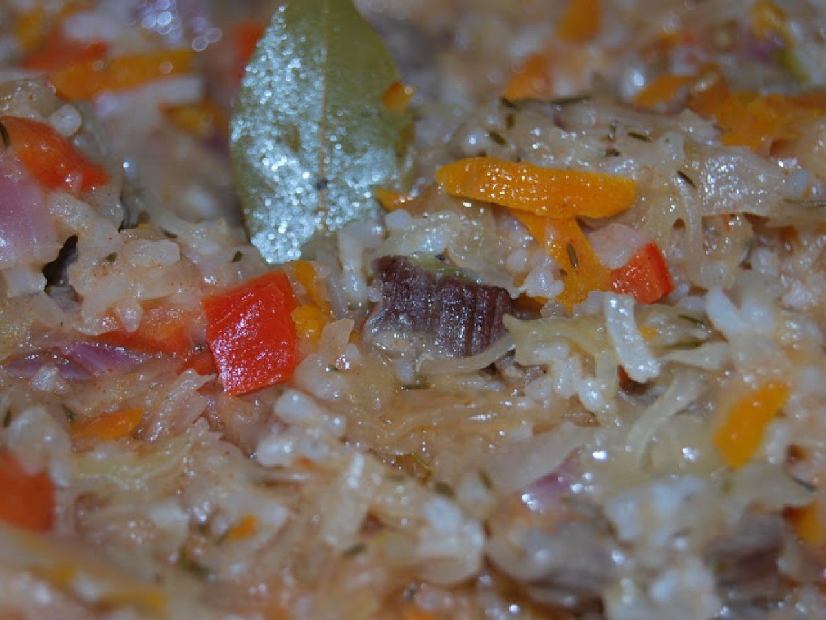 Mancarica cu varza acra si carne de vita PrecedentulUrmătorul Felul principalFoarte ușor40 min Trimite unui prieten Printează pagina Adresează o întrebare autorului Postează o poză cu rețeta gătită de tine Ingrediente 4 300 g gulas de vita 1 ceapa rosie 1 ardei rosu 1 morcov 300 g varza acra 1 ceasca de orez 2 foi de dafin 2 linguri pasta de rosii cimbru, sare, piper, boia