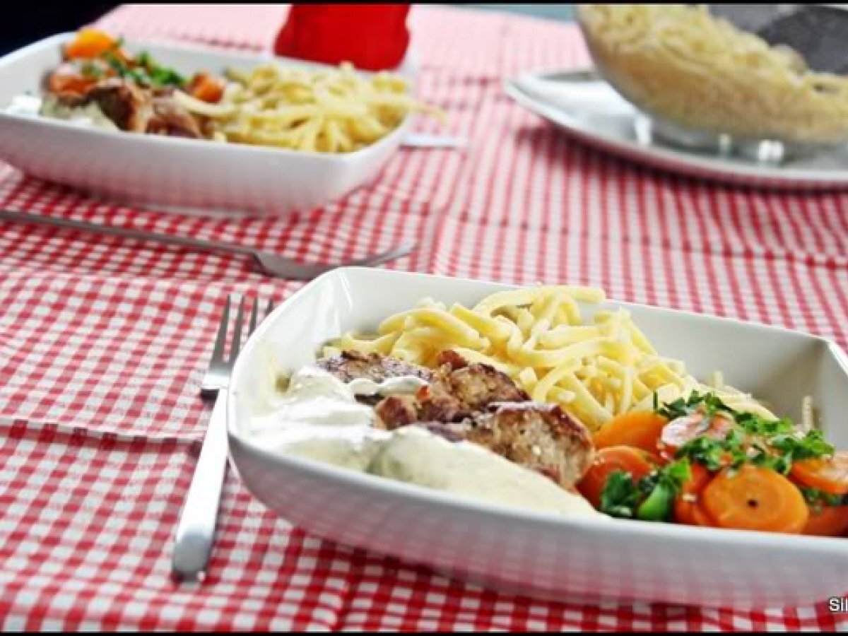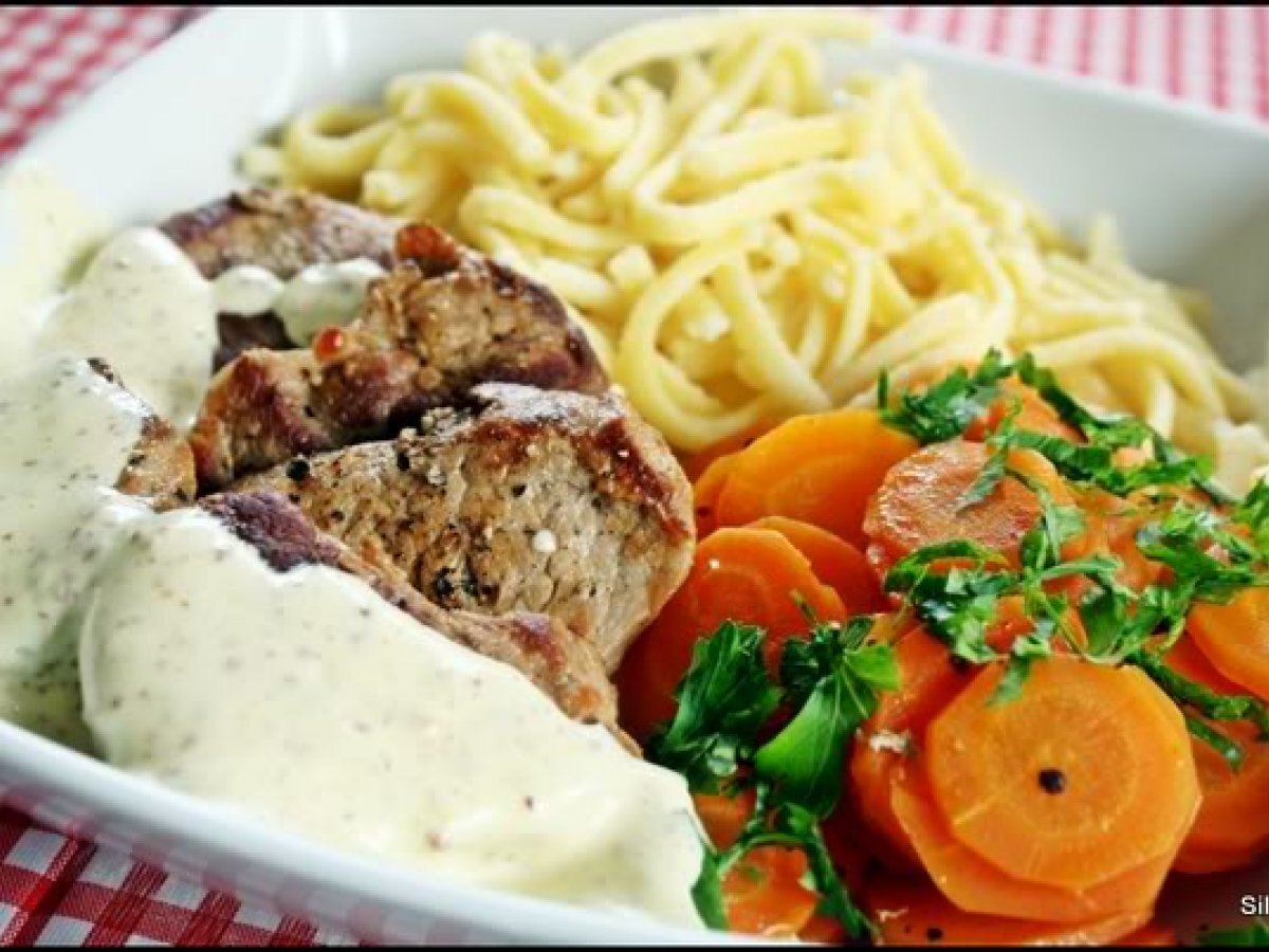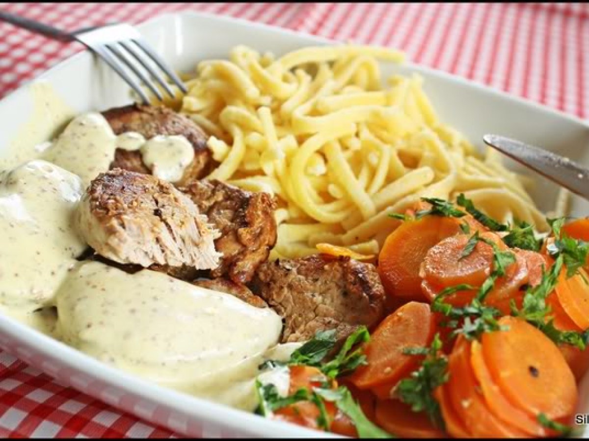 Medalioane de porc cu sos de smantana & mustar PrecedentulUrmătorul Felul principalFoarte ușor40 min Trimite unui prieten Printează pagina Adresează o întrebare autorului Postează o poză cu rețeta gătită de tine Ingrediente 4 file de porc sau muschiulet o legatura de morcovi 200 ml smantana lichida 2 linguri de mustar ( sau 1 lingura mustar normal & o lingura mustar Dijon) 300 ml supa patrunjel paste, taitei lati ( eu am folosit spatzle) sare, piper 3 linguri ulei