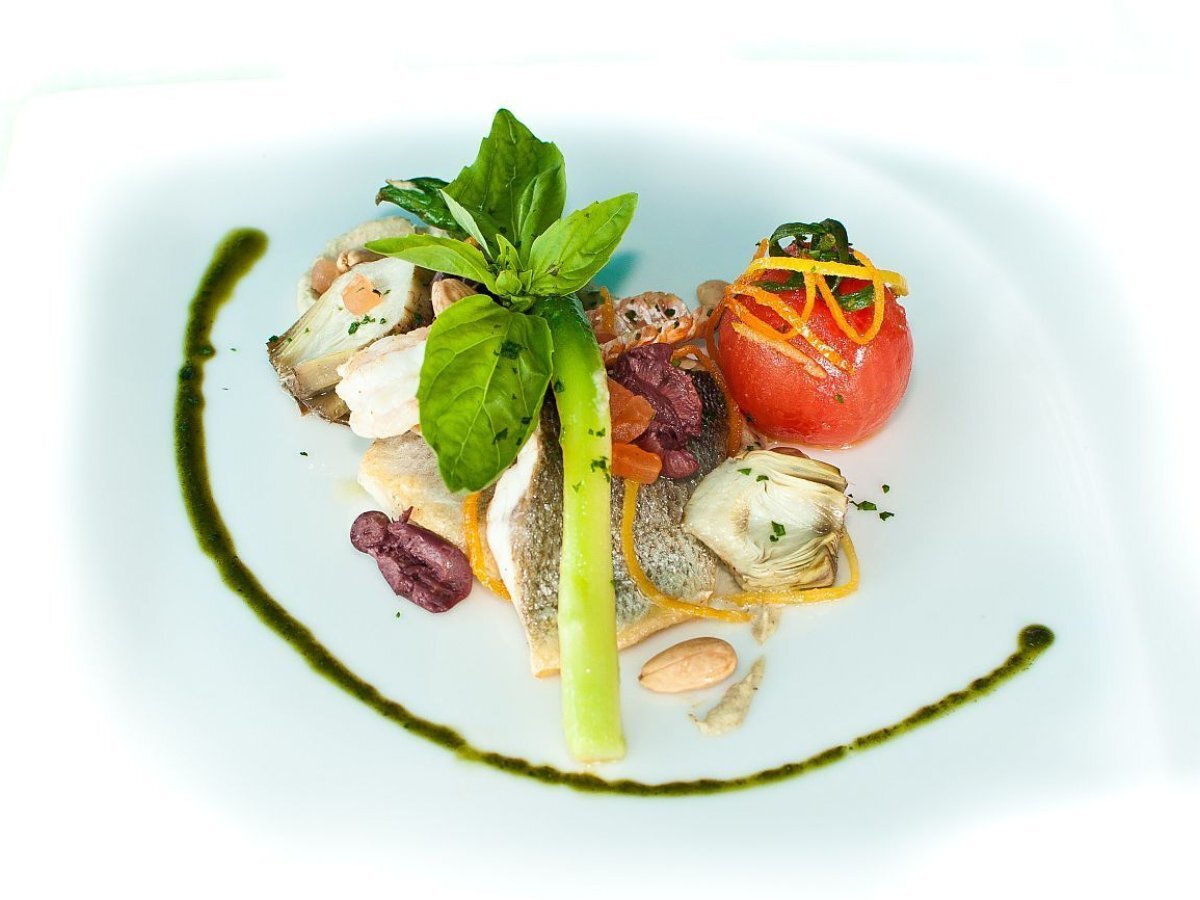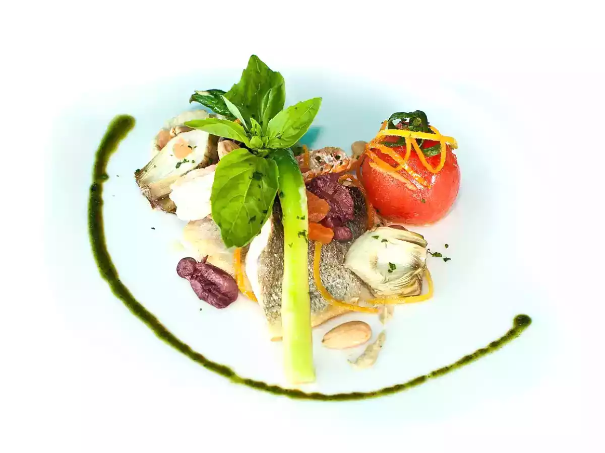 Medalion de sea bass in stil mediteranean by executive chef joseph hadad PrecedentulUrmătorul Felul principalUșor40 min Trimite unui prieten Printează pagina Adresează o întrebare autorului Postează o poză cu rețeta gătită de tine Ingrediente 1 Sea Bass 375 gr Inima de anghinare murata in ulei 120 gr Sparanghel verde 50 gr Rosii Cherry 20 gr Ulei de masline 80 ml Sare fina 2.5 gr Piper alb macinat 0.5 gr Rosii 35gr Lamai 30 gr Patrunjel 5 gr Busuioc 12.5 gr Migdale decojite prajite 10 gr Masline Kalamata 20 gr Usturoi 2 gr Patrunjel 5 gr