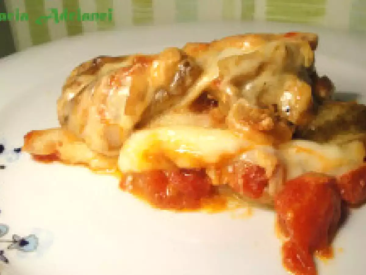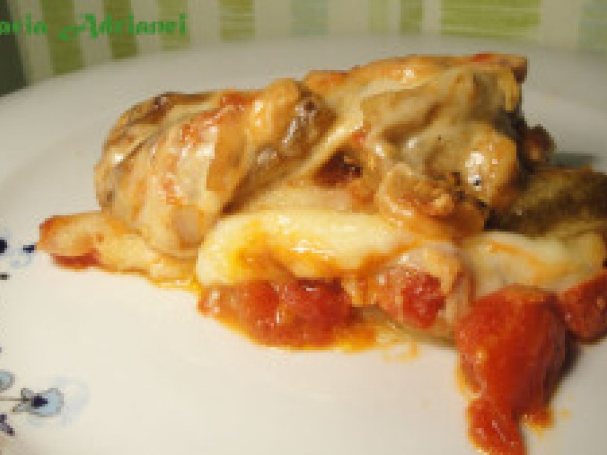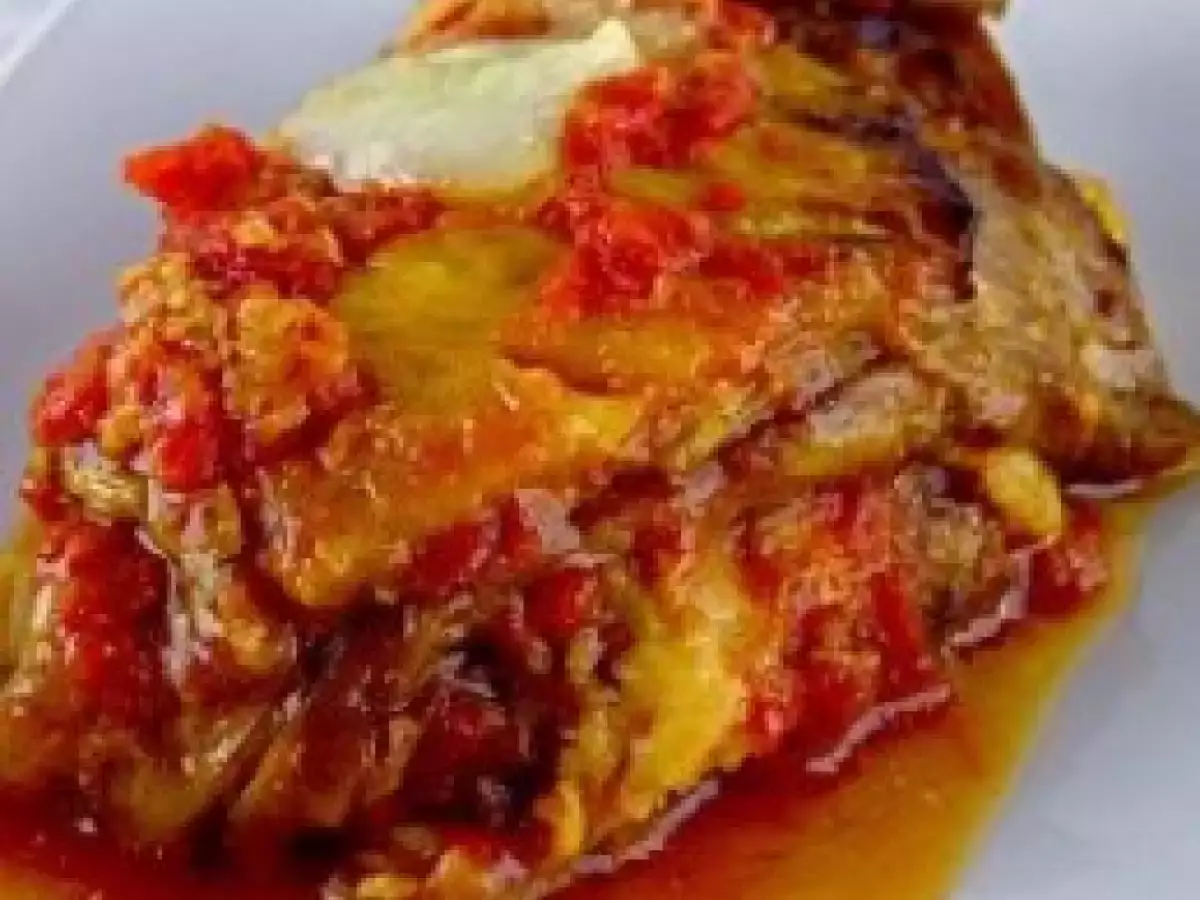 Melanzane alla parmigiana PrecedentulUrmătorul Felul principalFoarte ușor40 min Trimite unui prieten Printează pagina Adresează o întrebare autorului Postează o poză cu rețeta gătită de tine Ingrediente 4 4 vinete 1 conserva de rosii decojite si maruntite 2 pungi de mozzarella-eu le i-au de la supermarket 2 cani de parmigiano 1 ceapa ulei de masline sare busuioc felii de sunca subtiri asezate intre straturile de vinete