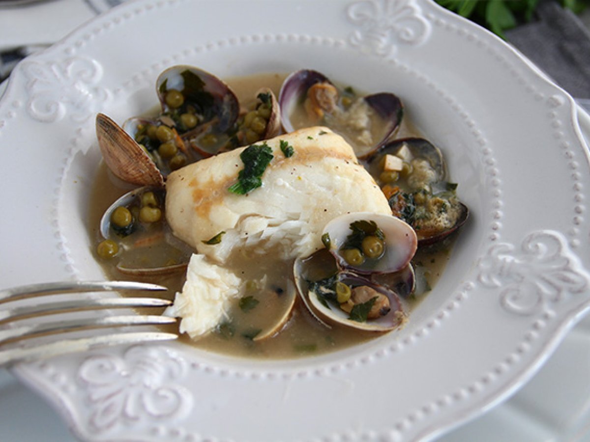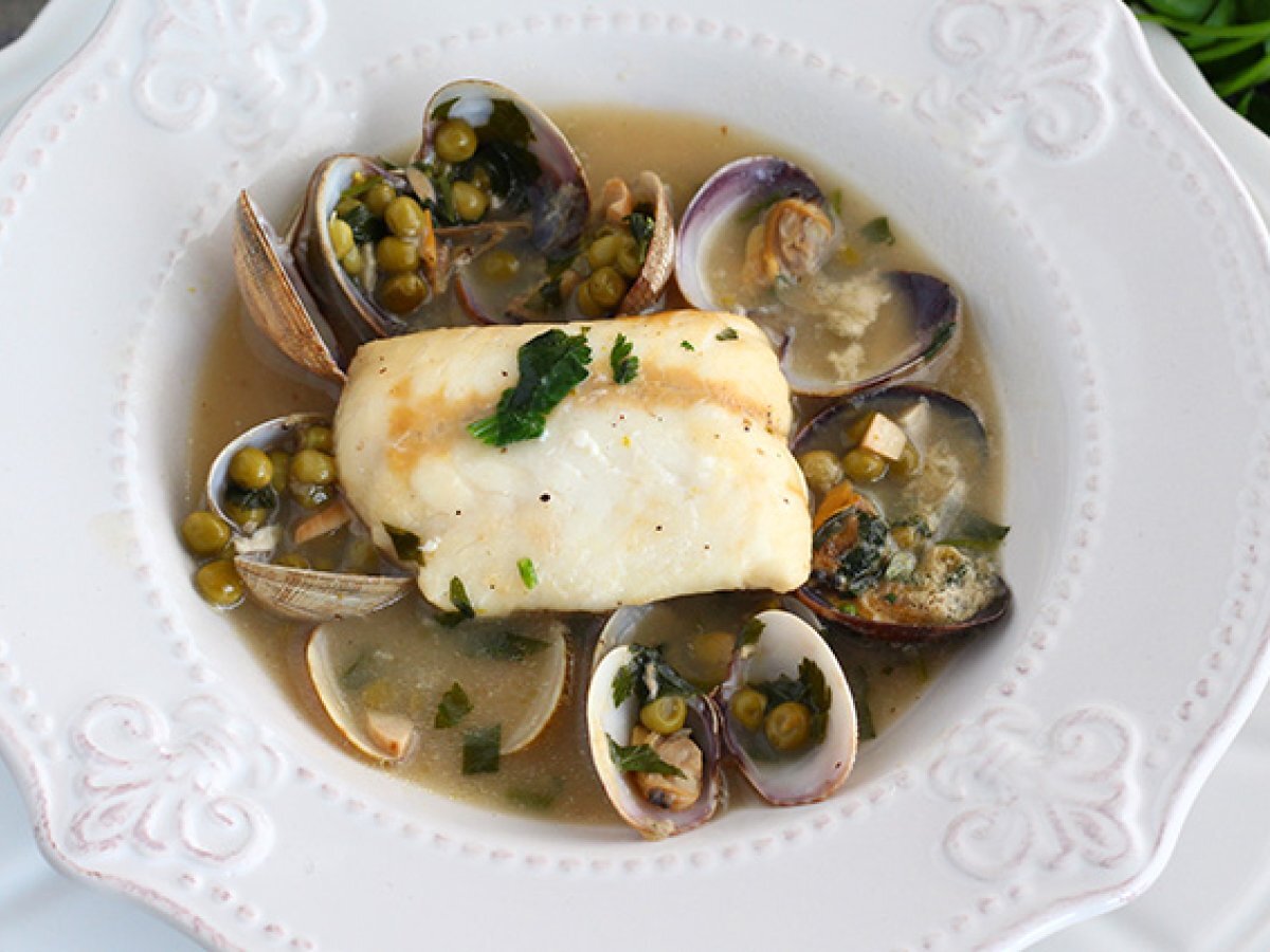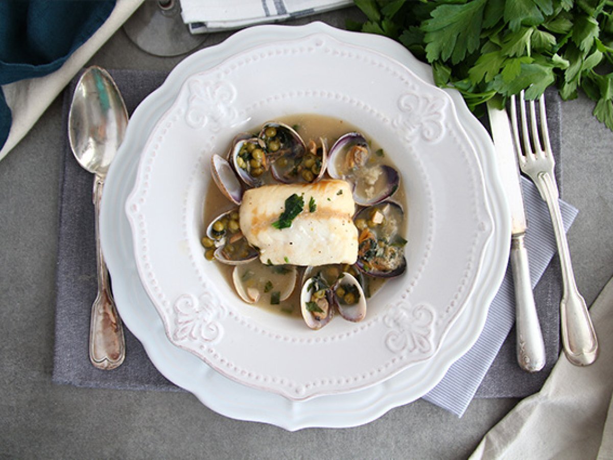 Adaugați fileurile de merluciu + scoicile + mazarea si acoperiti tigaia. Lasati sa fiarba 10 minute.
