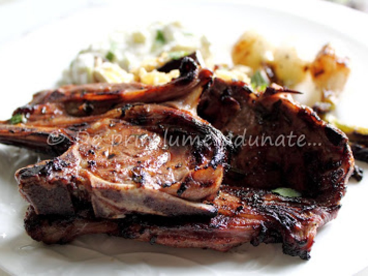 Miel pe gratar, marinat in lamaie, miere si menta PrecedentulUrmătorul Felul principalFoarte ușor35 min Trimite unui prieten Printează pagina Adresează o întrebare autorului Postează o poză cu rețeta gătită de tine Ingrediente 4 carne de miel 1/2 cup (120 ml) ulei de masline 1/2 cup (120 ml) zeama de lamaie 1/2 cup (120 ml) vin 1/4 cup (60 ml) miere 2 linguri de rozmarin proaspat tocat 3 linguri de menta proaspata tocata 4 catei de usturoi tocati 1 lingurita sare piper dupa gust