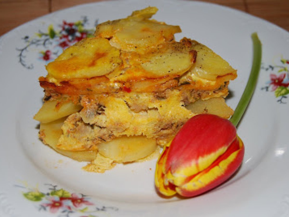 Musaca de cartofi PrecedentulUrmătorul Felul principalFoarte ușor1 oră Trimite unui prieten Printează pagina Adresează o întrebare autorului Postează o poză cu rețeta gătită de tine Ingrediente 2 1/2 kg carne tocata 5-6 cartofi 3 linguri sos de rosii 1 foaie de dafin cimbru marar patrunjel sare si piper 3 linguri smantana 3 oua 2 cepe
