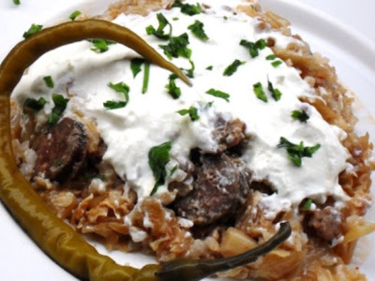 Musaca de varza acra sau varza a la cluj PrecedentulUrmătorul Felul principalFoarte ușor50 min Trimite unui prieten Printează pagina Adresează o întrebare autorului Postează o poză cu rețeta gătită de tine Ingrediente 8 1,5 kg varza murata 500 g carne macinata de porc sau amestec porc-vita 2 cepe 100 g orez 200 ml smantana 200 g carnati afumati, kaizer sare, piper, cimbru, pasta de rosii sau boia, foi de dafin. 1/3 varza 1/2 carne 1/2 orez 1/2 carnati 1/3 varza 1/2 carne 1/2 orez 1/2 carnati 1/3 varza