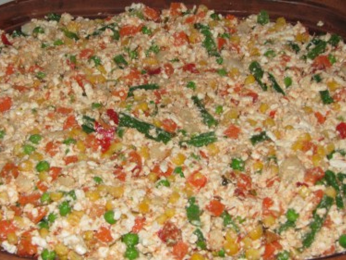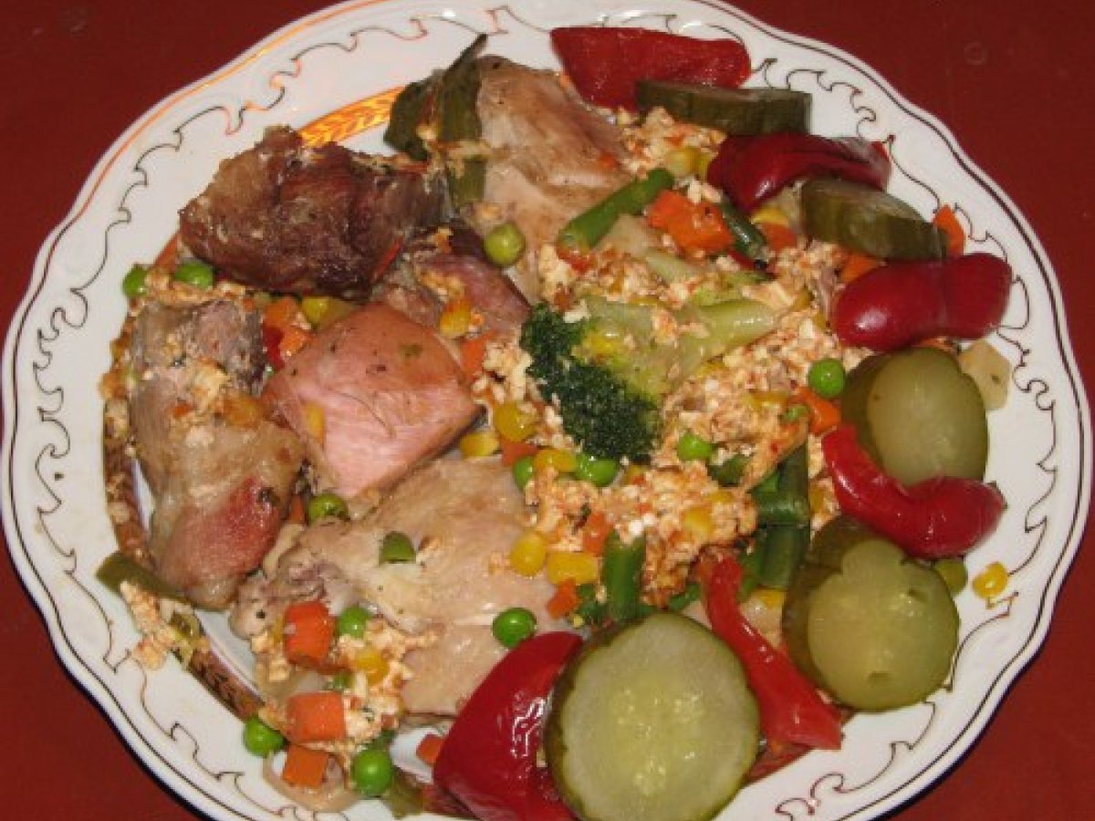 Muschi de porc afumat si pulpe superioare de pui cu legume mexicane si branza PrecedentulUrmătorul Felul principalFoarte ușor1 h 20 m Trimite unui prieten Printează pagina Adresează o întrebare autorului Postează o poză cu rețeta gătită de tine Ingrediente 4 Muschi de porc afumat (1,5 kg) Pulpe superioare de pui (2 kg) Legume mexicane (1,75 kg) Branza de vaca (1 kg) Sos de rosii (400 g) Condimente naturale (cimbru, leustean, busuioc, marar, oregano, foi de dafin etc.) Vin (300 ml)