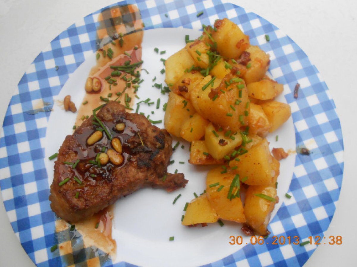 Muschi de porc cu sos de visine si cartofi taranesti la cuptor