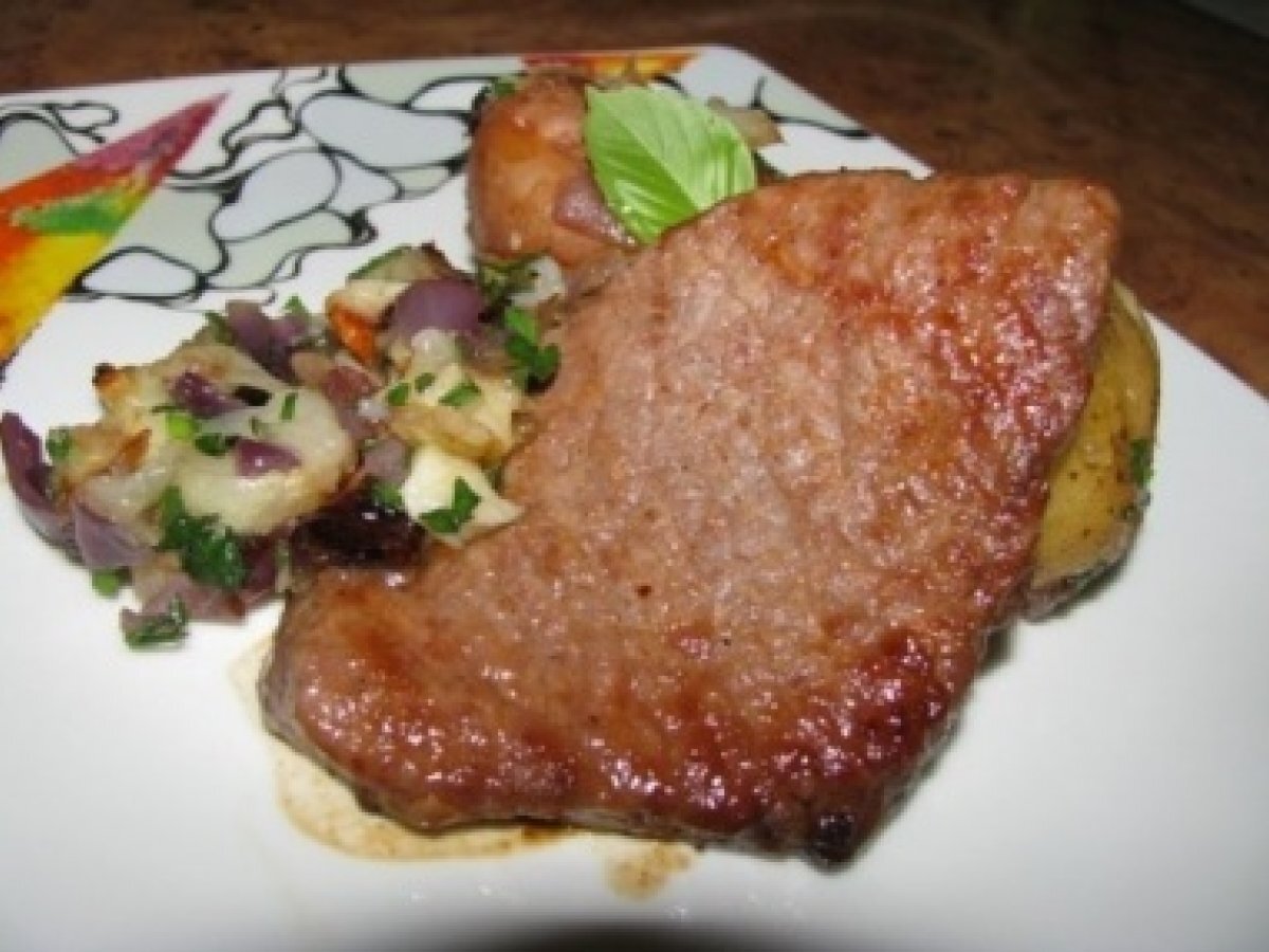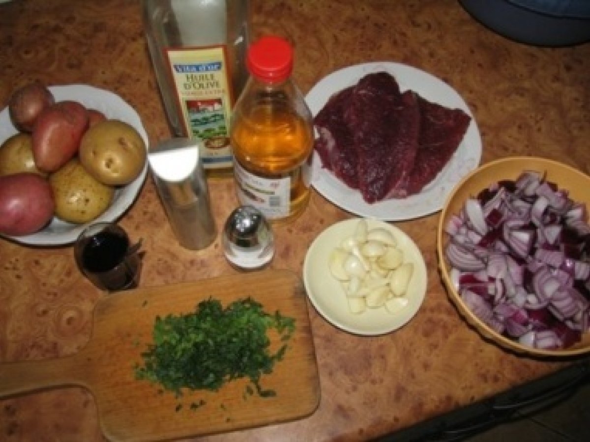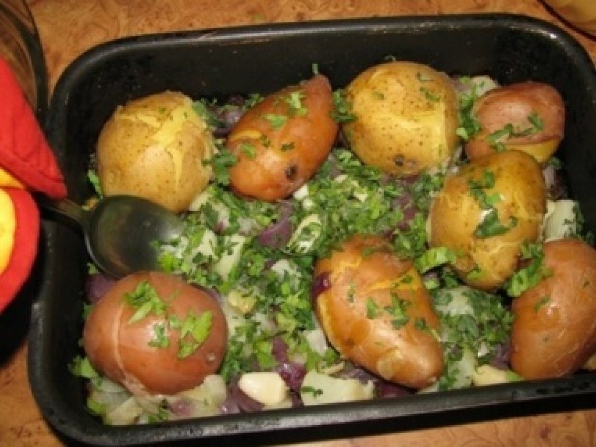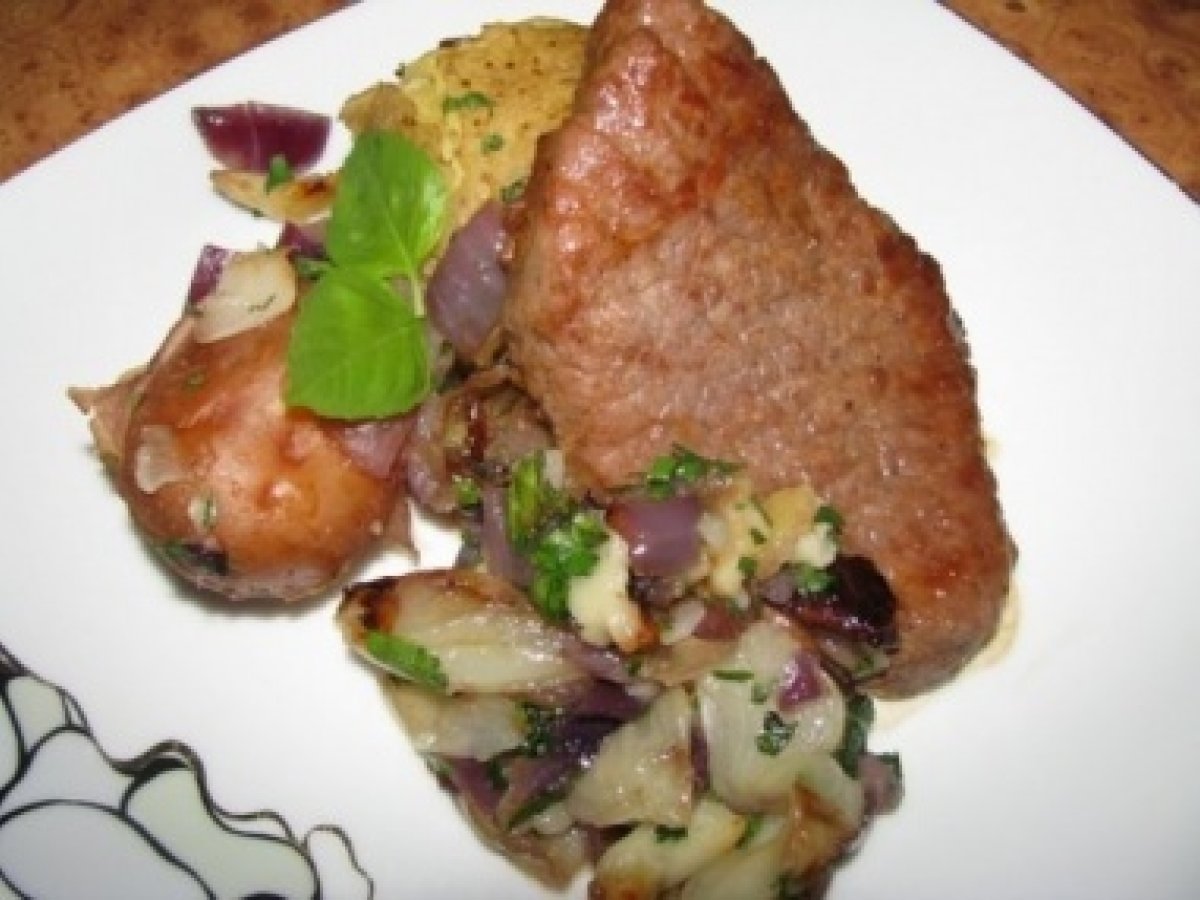 Muschi de vita la gratar cu ceapa, usturoi si cartofi copti in coaja PrecedentulUrmătorul Felul principalFoarte ușor2 ore Trimite unui prieten Printează pagina Adresează o întrebare autorului Postează o poză cu rețeta gătită de tine Ingrediente 6 500 g ceapa, tocata mare 2 capatani de usturoi, curatate 8 cartofi de marime mica sau medie, spalati 3 linguri ulei de masline 1 lingurita otet 2 linguri patrunjel proaspat tocat Sare si piper negru 4 felii de muschi (aprox. 125 gr fiecare) 1 lingura sos Worcestershire