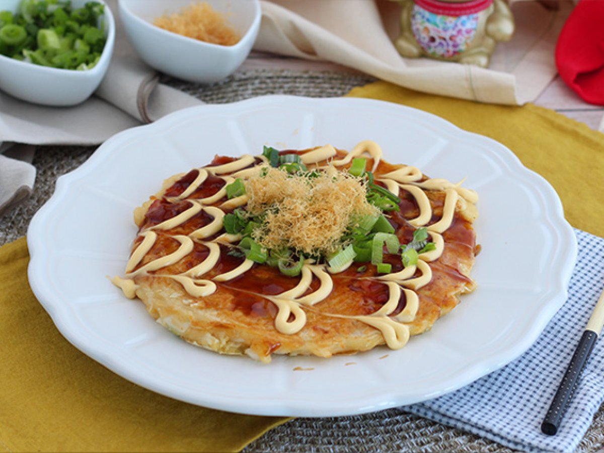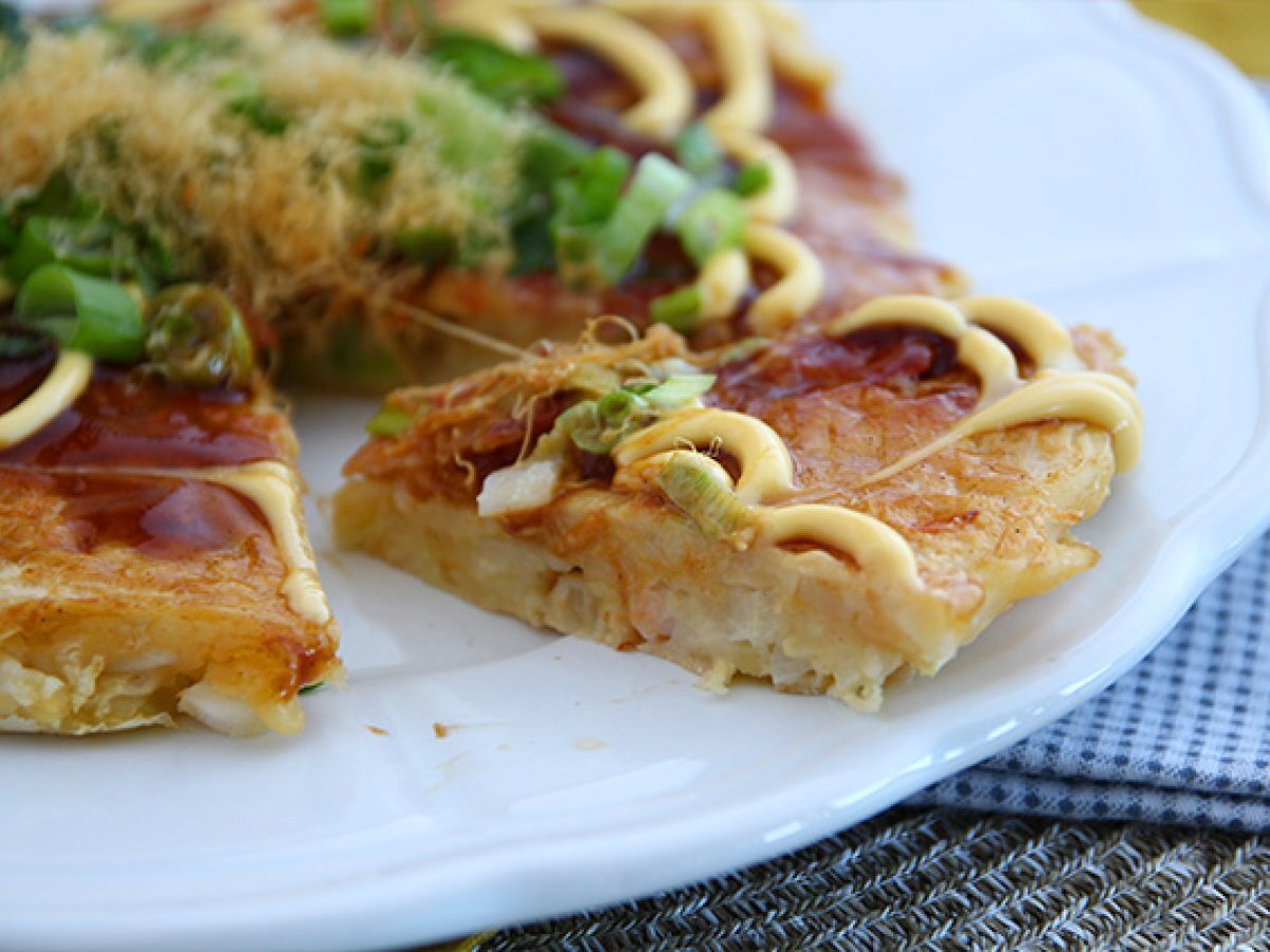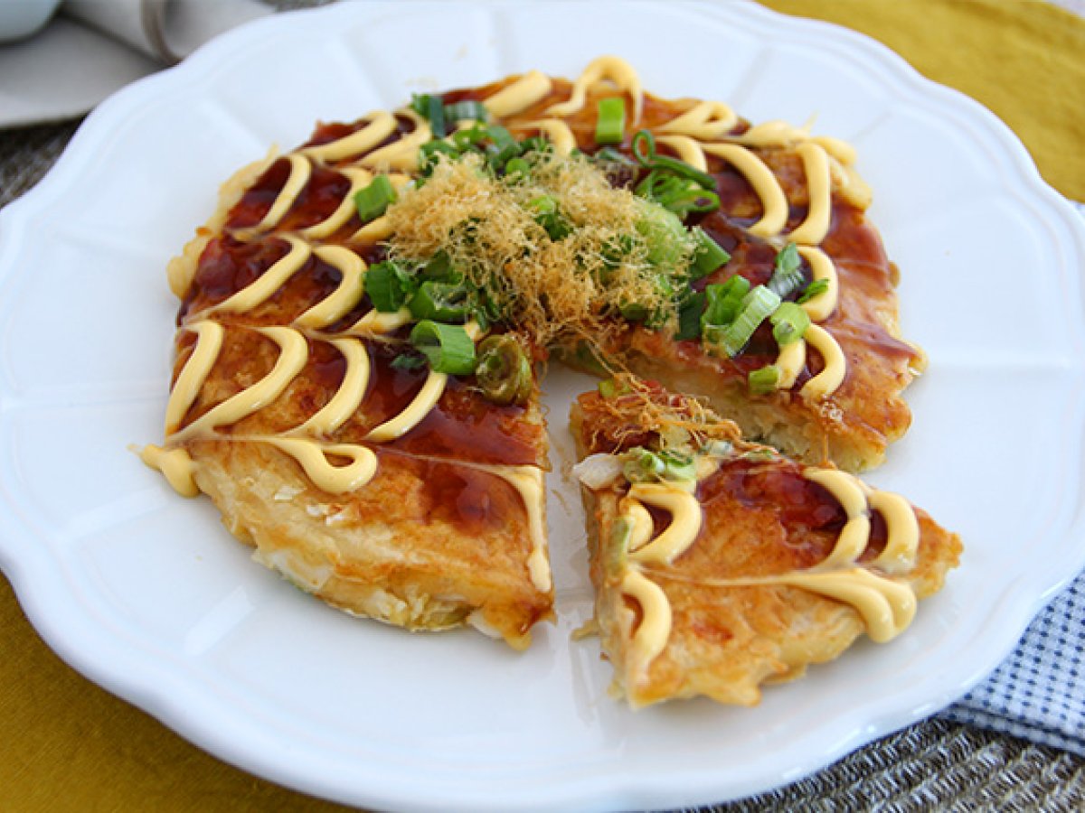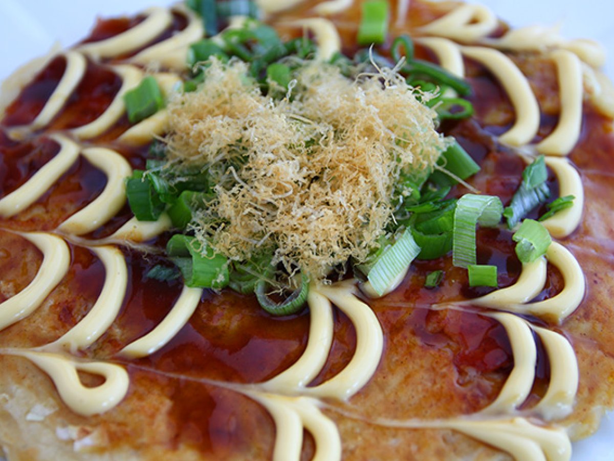 Okonomiyaki este o mâncare tradițională japoneză, originară din Osaka, dar este populară și în Tokyo, având variații regionale.