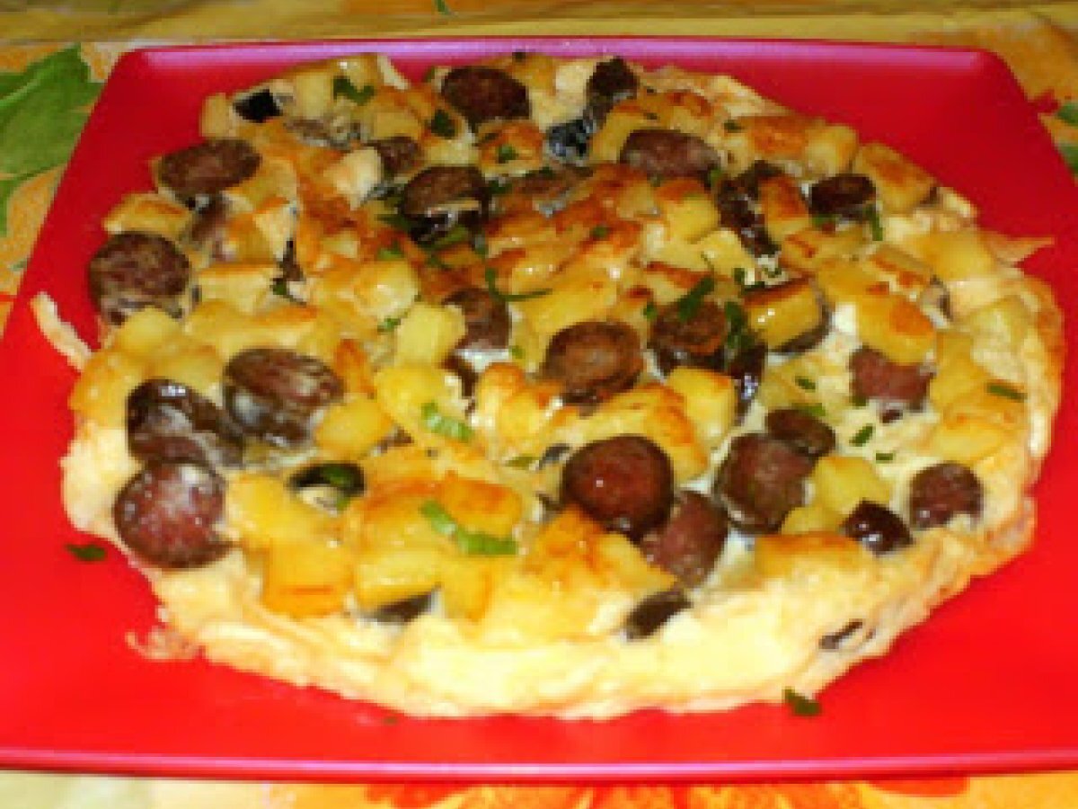Omleta cu cartofi si carnati Felul principalFoarte ușor20 min Trimite unui prieten Printează pagina Adresează o întrebare autorului Postează o poză cu rețeta gătită de tine Ingrediente 6 4 oua 4 carnati 1 cartofi 2-3 masline sare piper boia dulce patrunjel