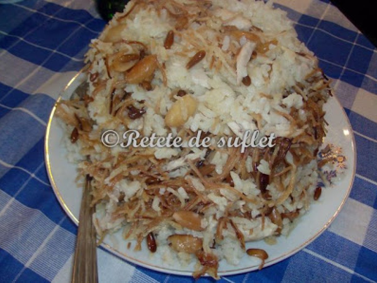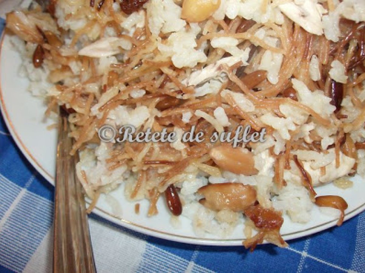 Orez arabesc PrecedentulUrmătorul Felul principalFoarte ușor45 min Trimite unui prieten Printează pagina Adresează o întrebare autorului Postează o poză cu rețeta gătită de tine Ingrediente 4 1 pui, taiat bucati 1 morcov 1 ceapa 1 telina mica 100 g fidea 100 g migdale crude,decojite 30 g muguri de pin 50 g stafide 300 g orez 5 pastai de cardamom (optional) sare dupa gust 100 g unt 50 ml ulei