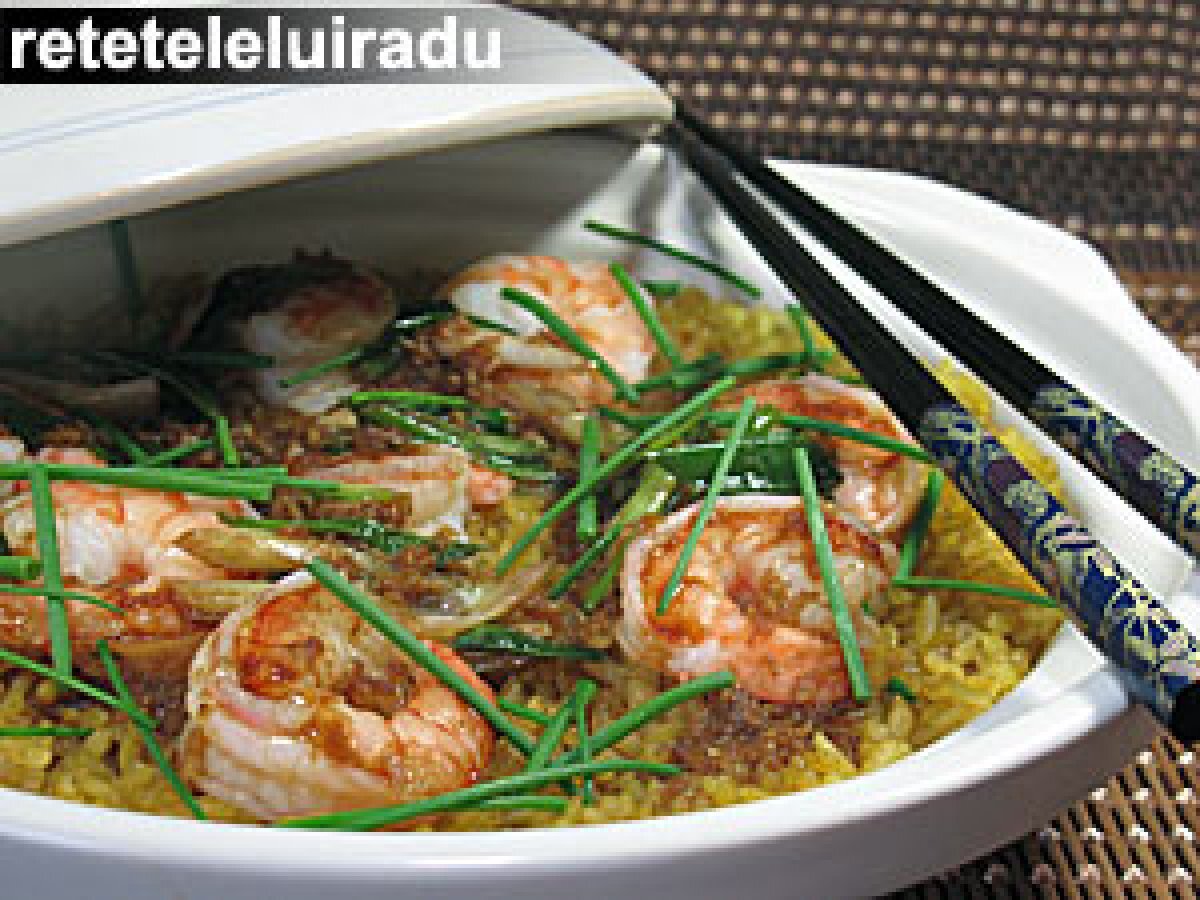 Orez cu curry si creveti Felul principalFoarte ușor30 min Trimite unui prieten Printează pagina Adresează o întrebare autorului Postează o poză cu rețeta gătită de tine Ingrediente 2 1 cana cu orez cu lung 1 cana cu apa 8 creveti mari, decorticati si curatati 2 linguri de sos de soia light 5 linguri de vin de orez 1 lingura de amestec curry chinezesc 1 lingura de suc de lamaie 2 lingurite de zahar brun 2 linguri de sos de soia dark 2 cepe verzi, taiate bucati de 2-3 cm, pe diagonala 1 catel de usturoi, dat prin razatoare 1 lingurita de ghimbir, data prin razatoare 2 lingurite de ulei de arahide 1/2 lingurita de piper alb, macinat 1 lingurita de ulei brun de susan frunze proaspete de cepsoara (chives), rupte - bucatele, pentru ornat