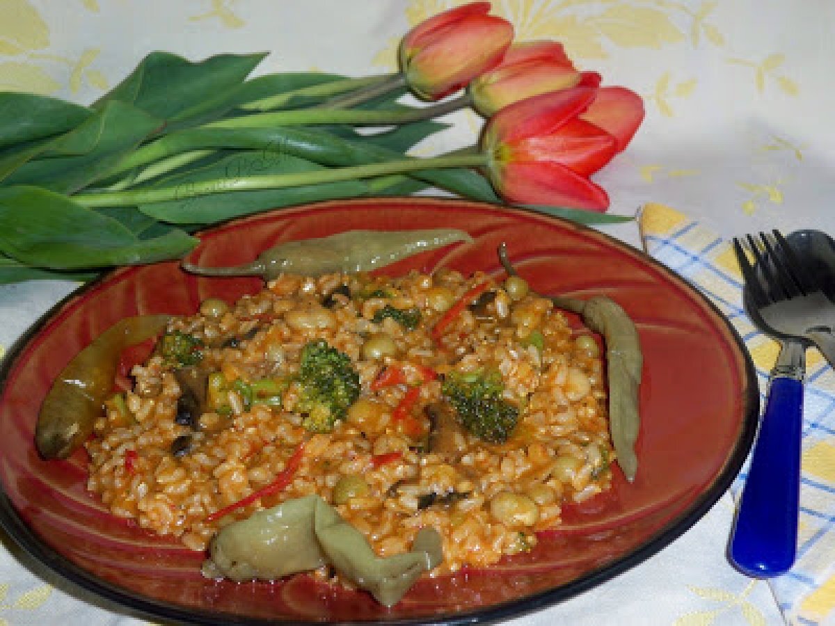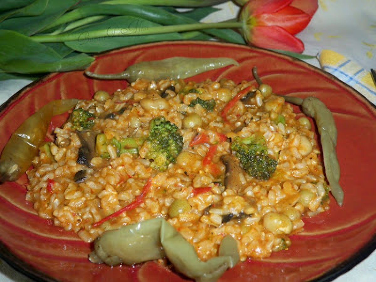 Orez picant cu legume PrecedentulUrmătorul Felul principalFoarte ușor35 min Trimite unui prieten Printează pagina Adresează o întrebare autorului Postează o poză cu rețeta gătită de tine Ingrediente 4 5 ciuperci taiate felii 300 g orez integral 1 ardei rosu taiat felii 2 cepe taiate julien 1 conserva mazarecateva buchetele de brocolichilisare,piperapa 3 linguri uleifoi dafinpasta de gulas iute
