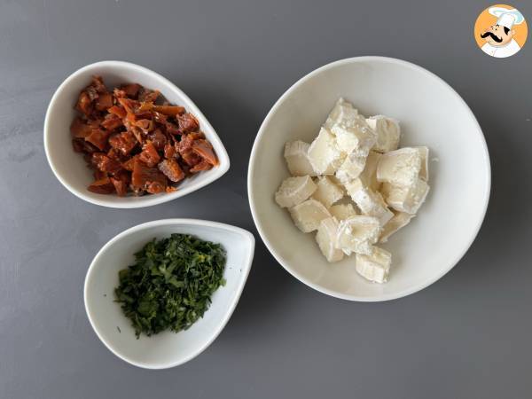 Tăiați mai întâi pătrunjelul, roșiile uscate și brânza de capră.