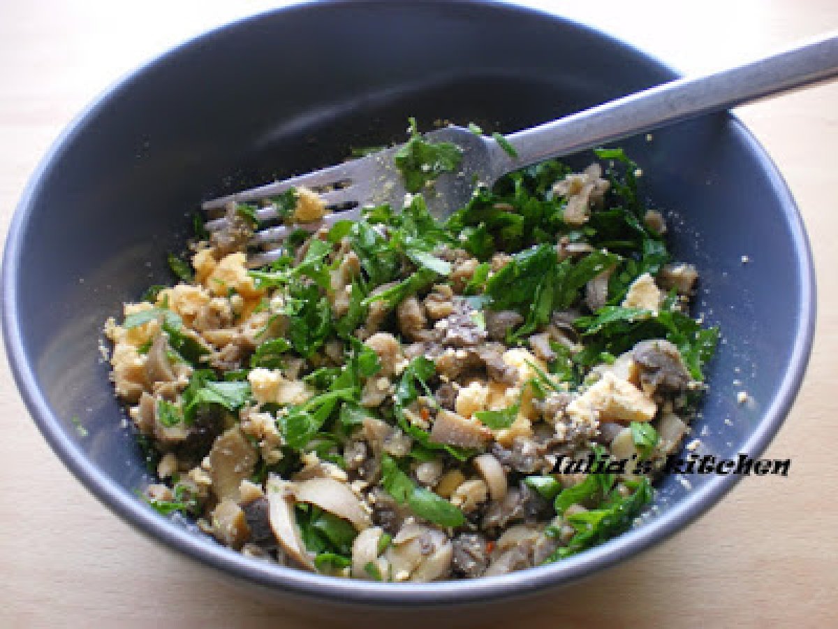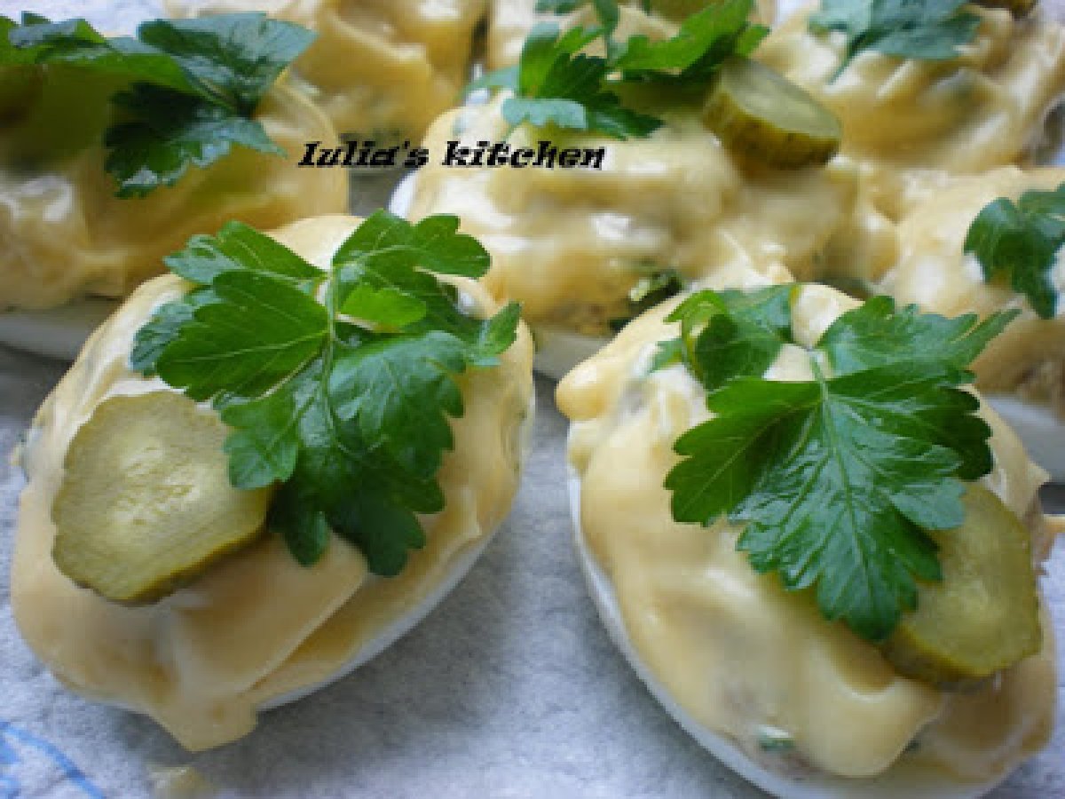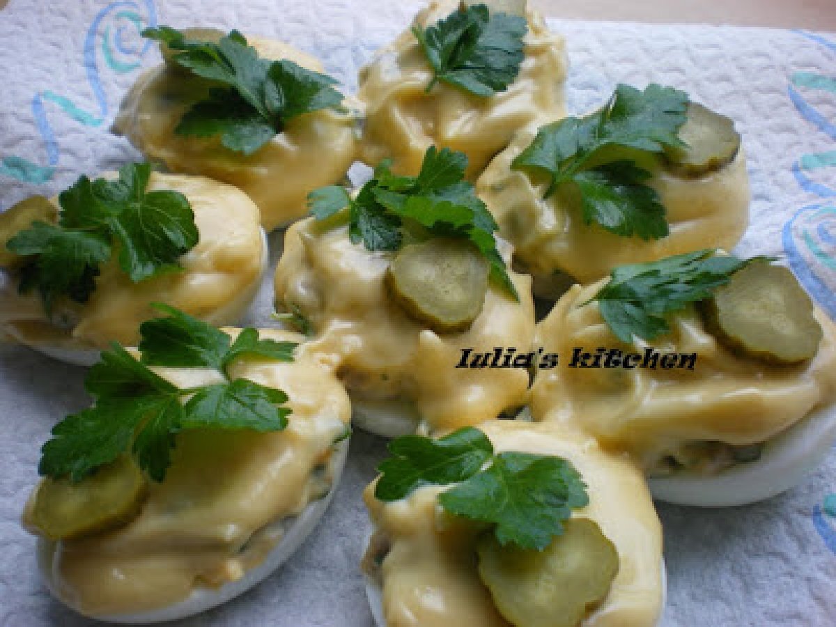 Oua umplute cu ciuperci PrecedentulUrmătorul Felul principalFoarte ușor40 min Trimite unui prieten Printează pagina Adresează o întrebare autorului Postează o poză cu rețeta gătită de tine Ingrediente 1 4 oua 1 galbenus 1 castravete murat 100 g ciuperci din conserva 1 lingurita mustar zeama de lamaie patrunjel verde ulei sare,piper