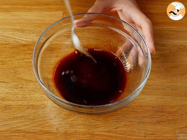 Pregatiti sosul: amestecati zaharul, sosul de soia, otetul de orez, sucul de lamaie verde si sosul de peste.