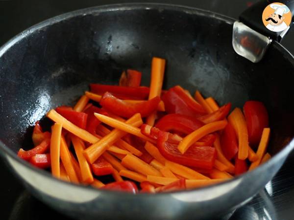 Scoateti tofu si pastrati uleiul. Adaugati ardeiul taiat in fașii, morcovii taiati in betisoare si sotati 2 pana la 3 minute.