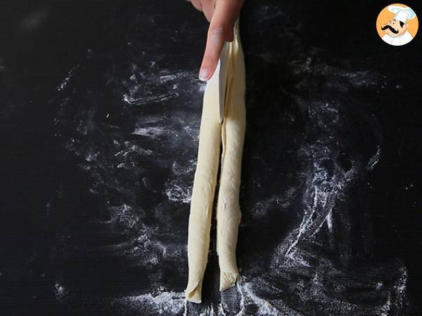 Rulati aluatul si apoi intindeti usor pentru a-l lungi. Taiati pe jumatate, in lungime.